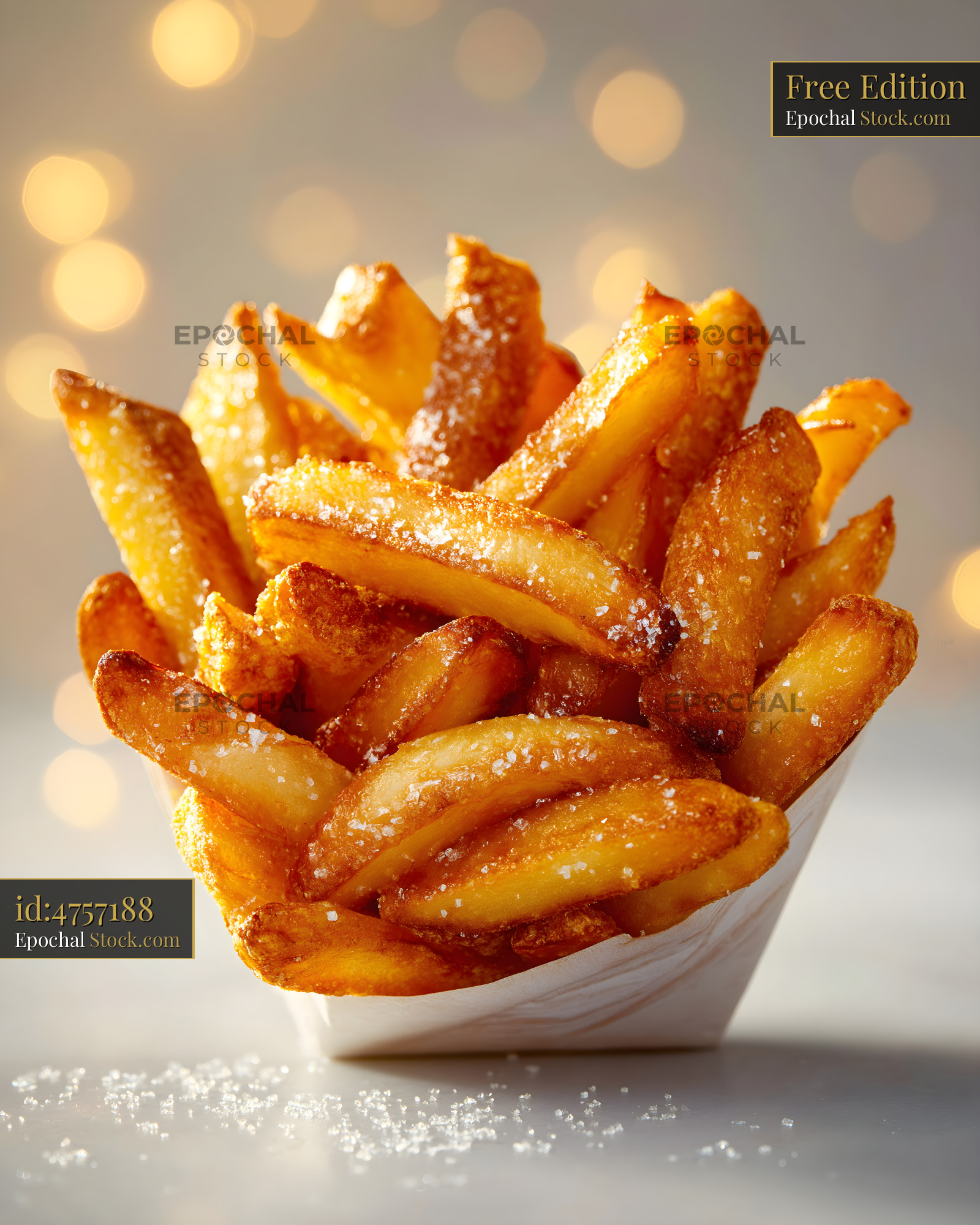 A serving of crispy french fries is in a paper cup. The fries are golden and have salt on them. Soft lights are seen in the background, creating a warm atmosphere.