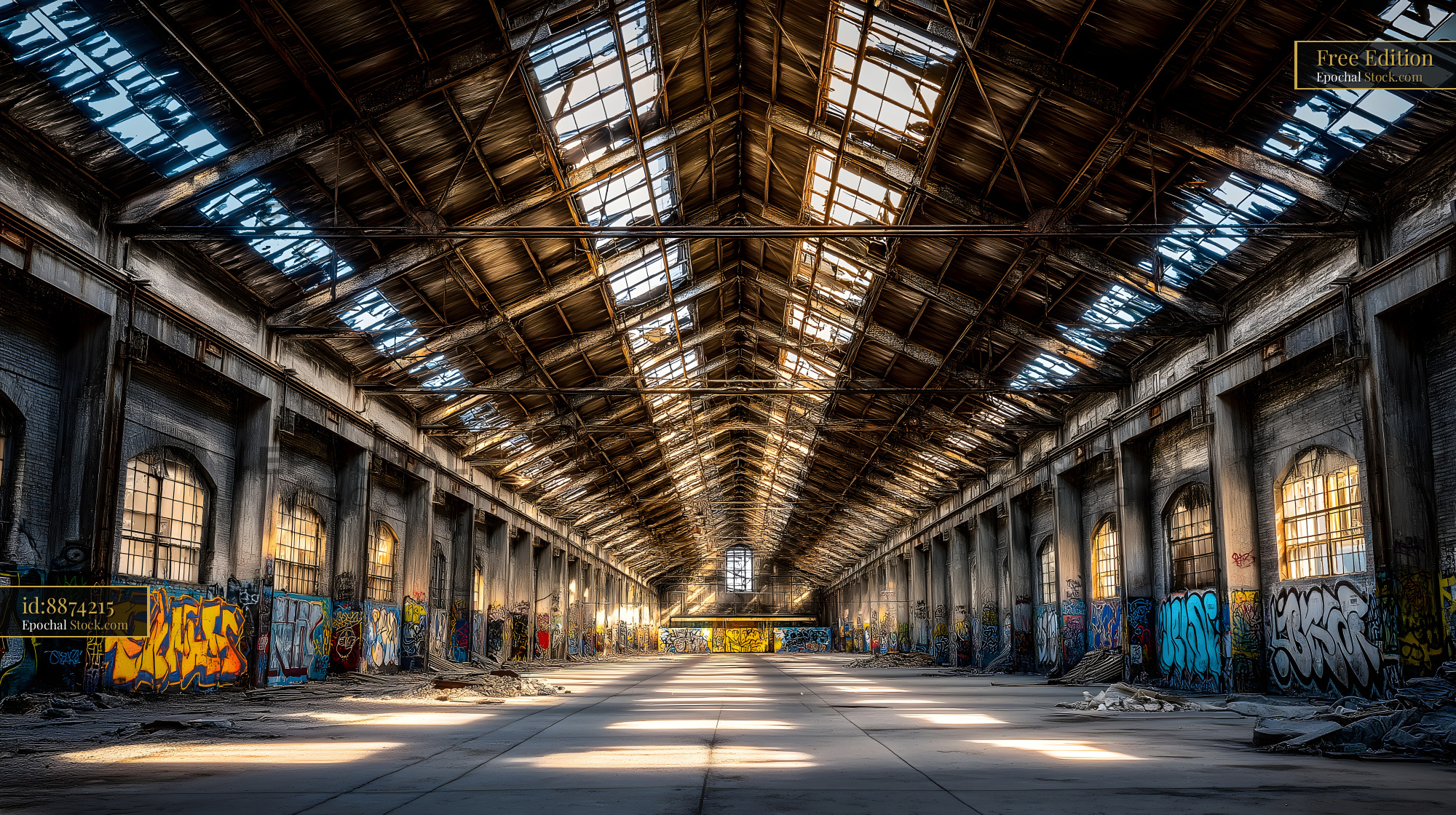 Abandoned warehouse with graffiti and sunlight streaming in Free Premium Stock Photo