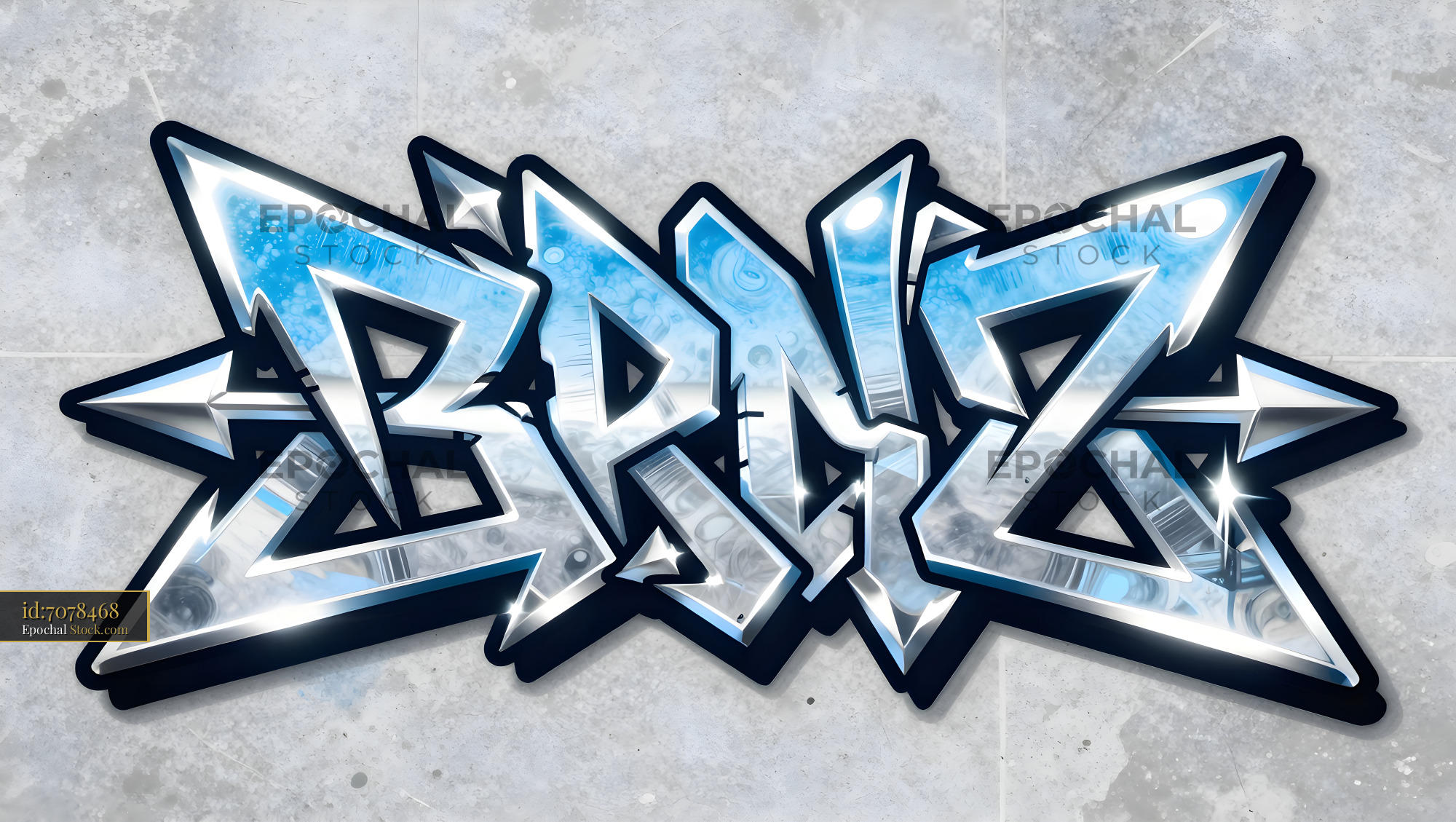 A bright graffiti design is painted on a concrete wall. The letters show sharp edges and reflective details. This artwork reflects the city's street culture and creativity.