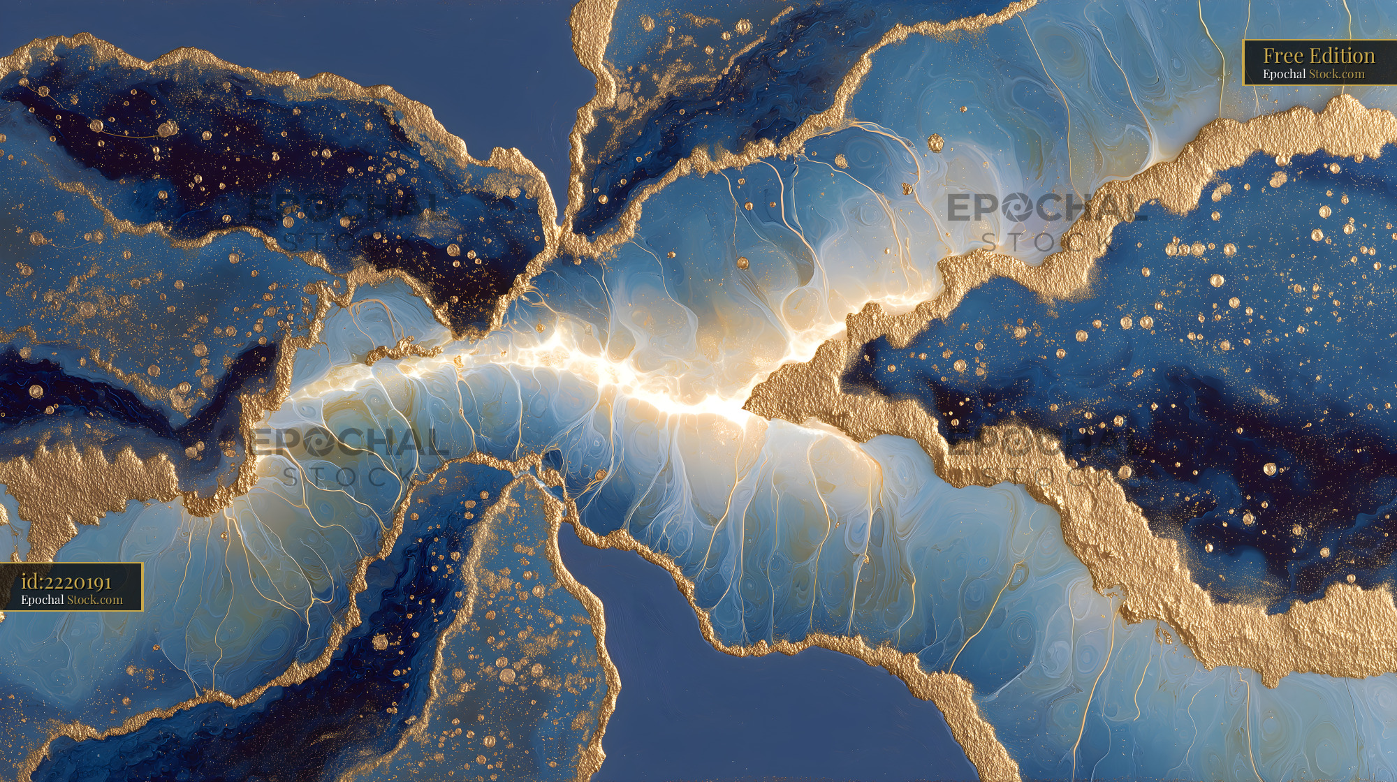 A mix of blue and gold colors arranged in an abstract style. The design features flowing shapes and lines that create a sense of movement.