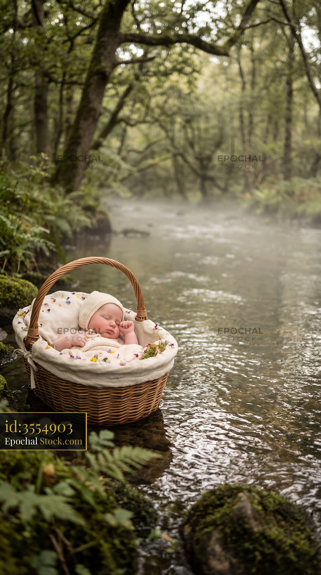 A baby lies asleep in a basket placed on a rock by a stream surrounded by trees. Soft water flows nearby, creating a quiet scene in the forest.