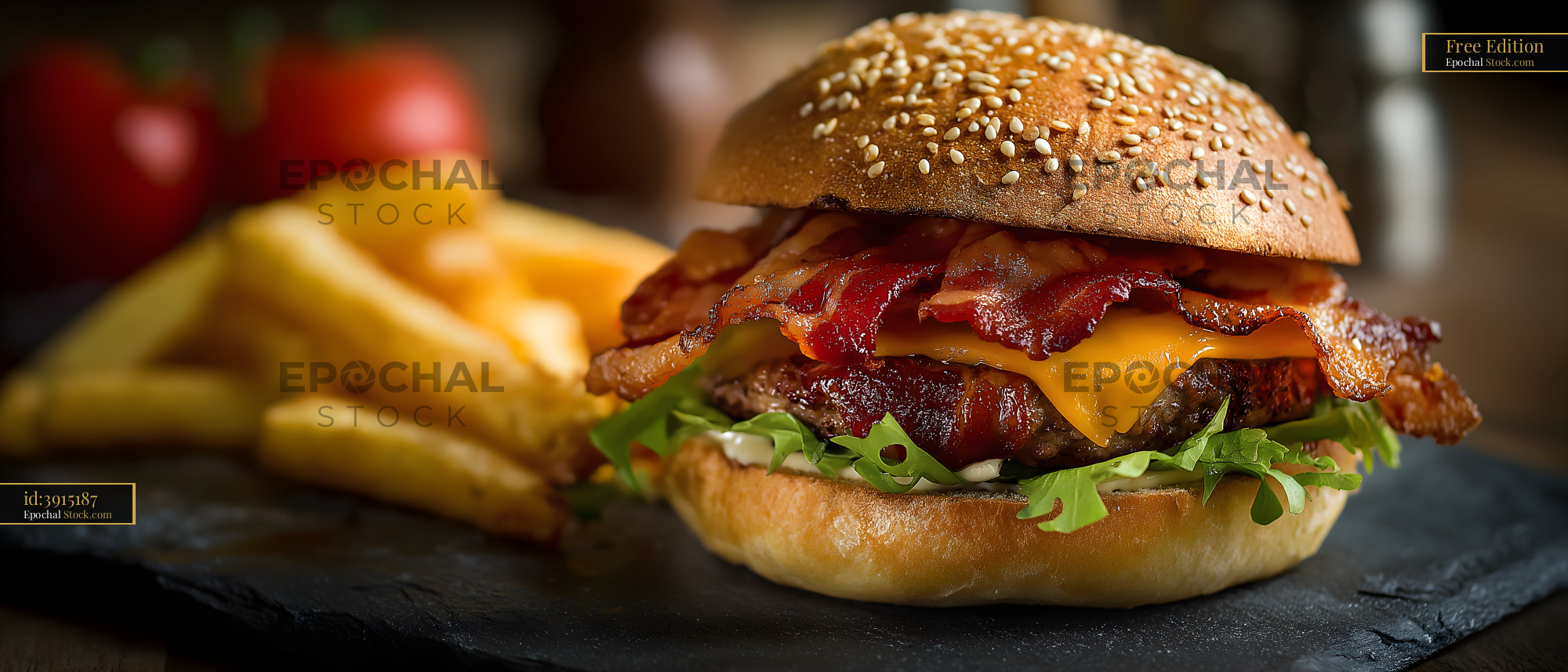 A sandwich filled with a beef patty, bacon, and cheddar cheese sits on a black plate. Next to it are crispy golden fries. Tomatoes are visible in the background.