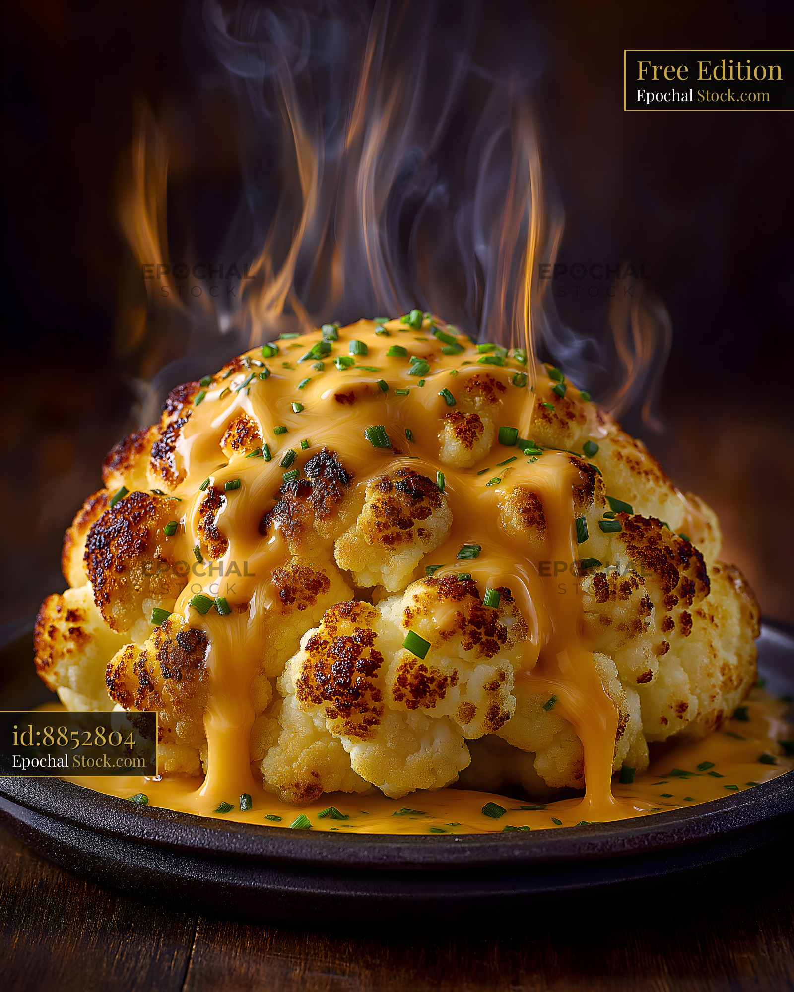 A baked cauliflower sits on a black plate. Cheese sauce covers the cauliflower and steam rises from it. Chopped green herbs garnish the dish.