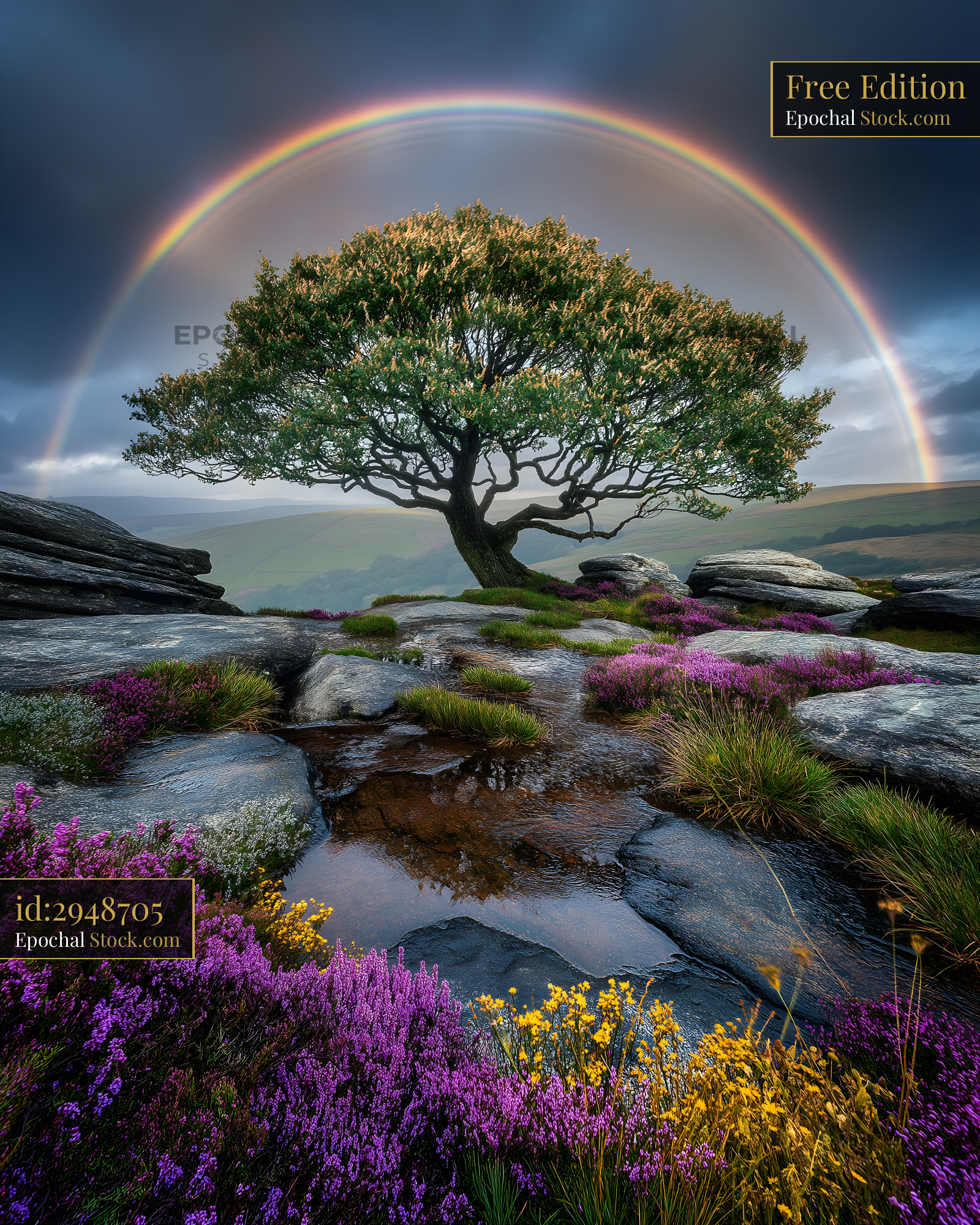 Beautiful tree under a rainbow sky with flowers and rocks Free Premium Stock Image