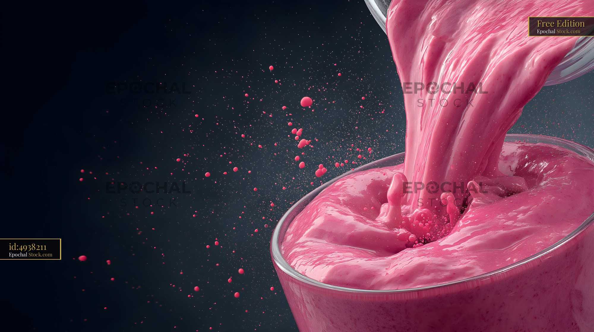 A thick berry smoothie is being poured from a container into a glass. Pink liquid flows out with droplets splashing around. The background is dark, highlighting the movement of the smoothie.