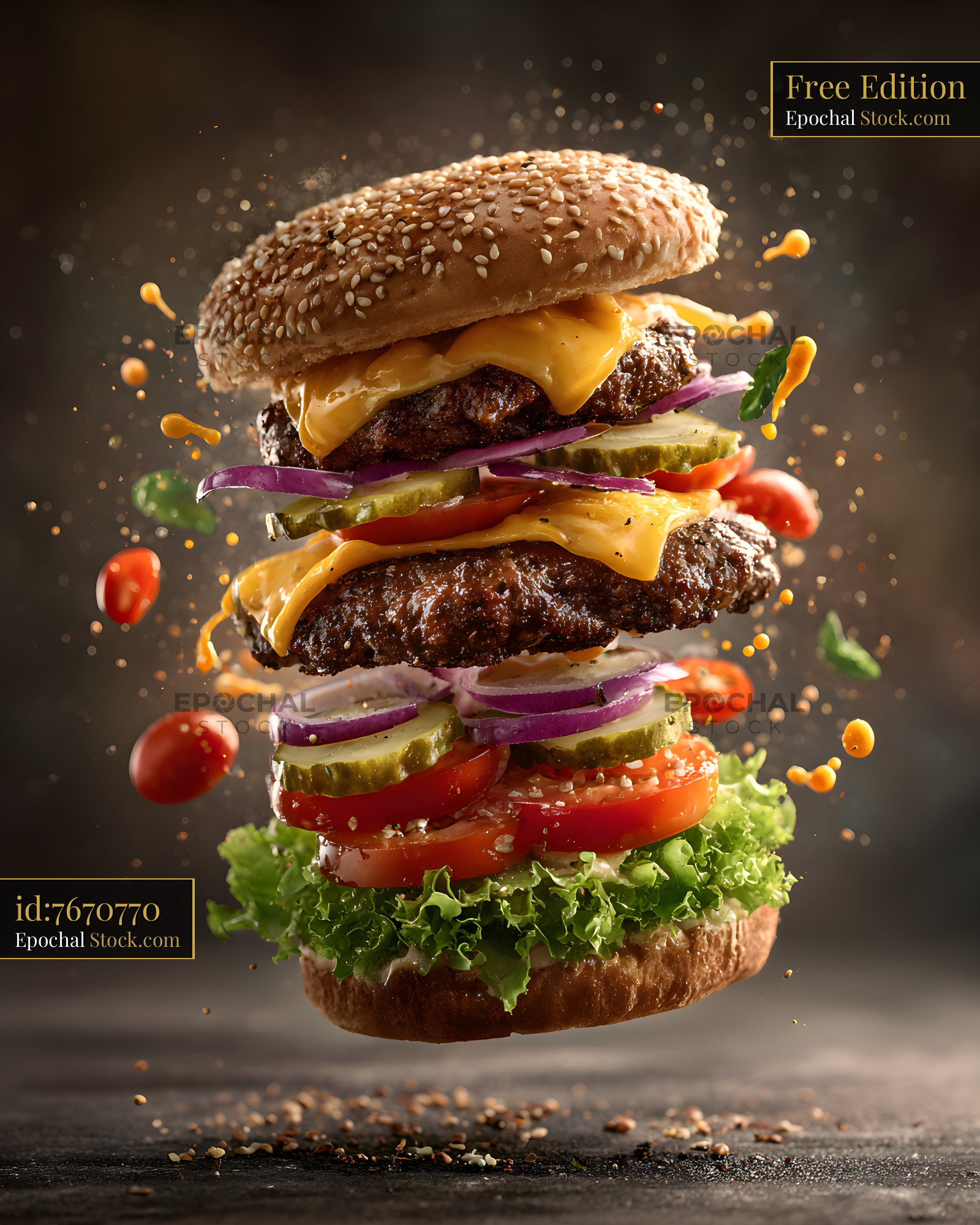 A large burger is assembled with layers of meat, cheese, lettuce, tomato, and onion. The ingredients are flying and fresh, creating a fun scene in a kitchen setting.