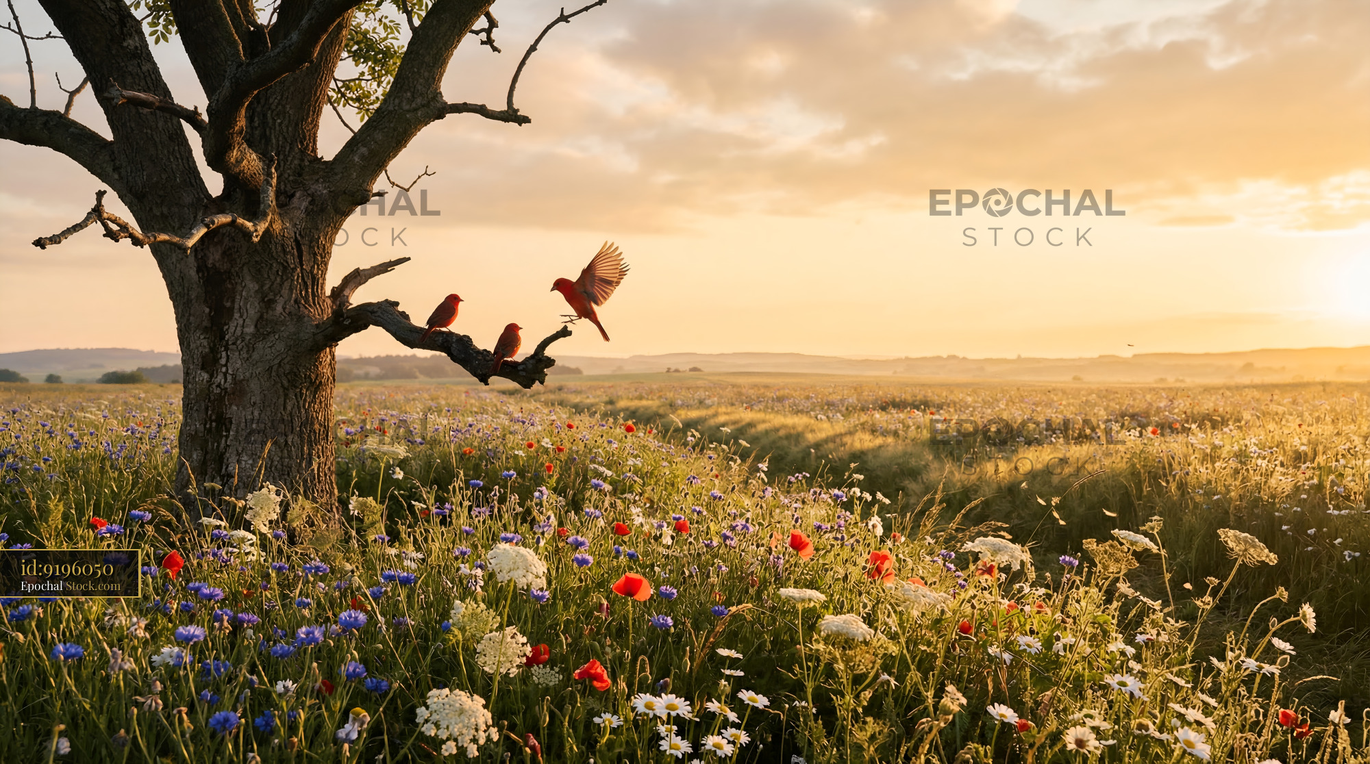 Two birds fly near a tree while other birds sit on a branch. The field is filled with colorful flowers during sunset. The sun sets behind distant hills and creates a warm glow.