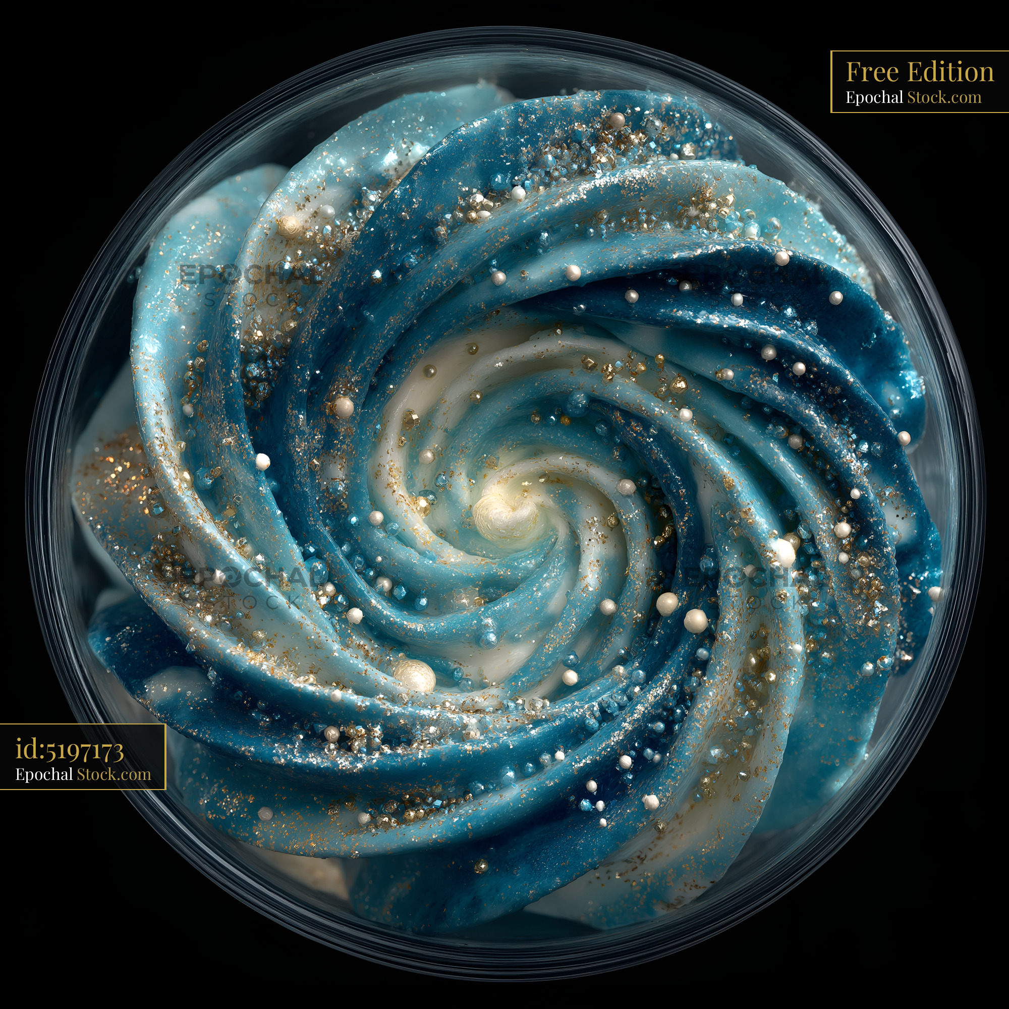 A close view of a dessert showing blue and white swirl patterns on top. Tiny sprinkles create a shining effect. This can be seen in a clear cup placed against a dark background.