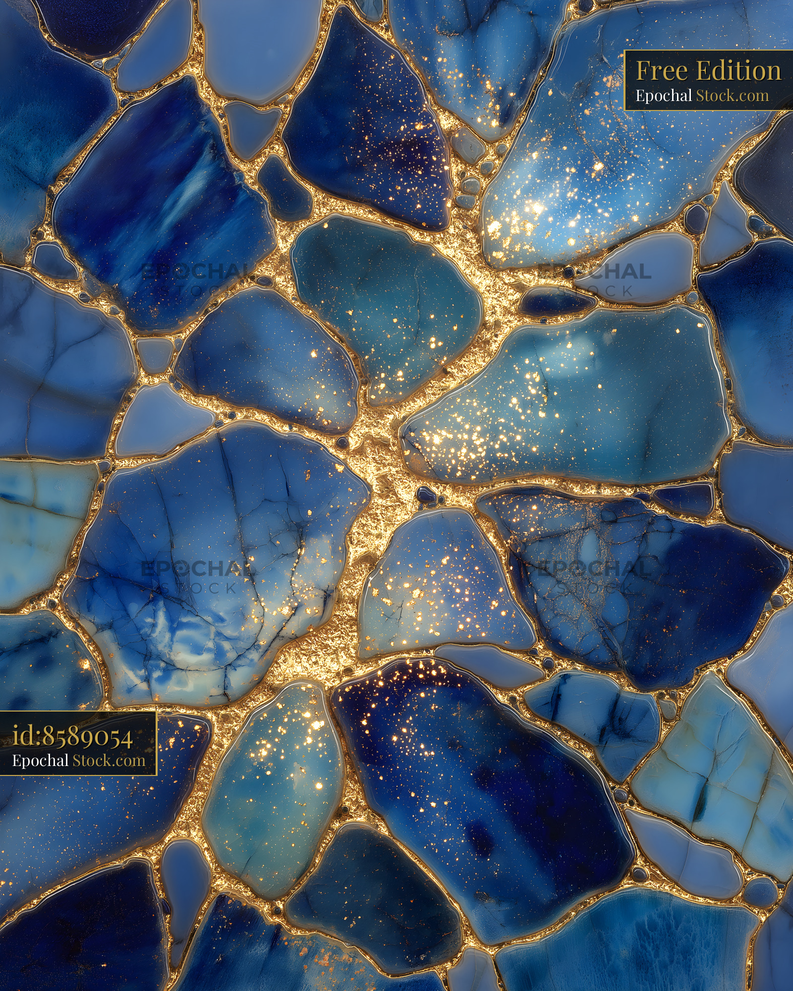 A design features pieces of blue stones arranged with lines of gold. The stones show various shades of blue and a mix of glossy and matte finishes. Light reflects off the surfaces.