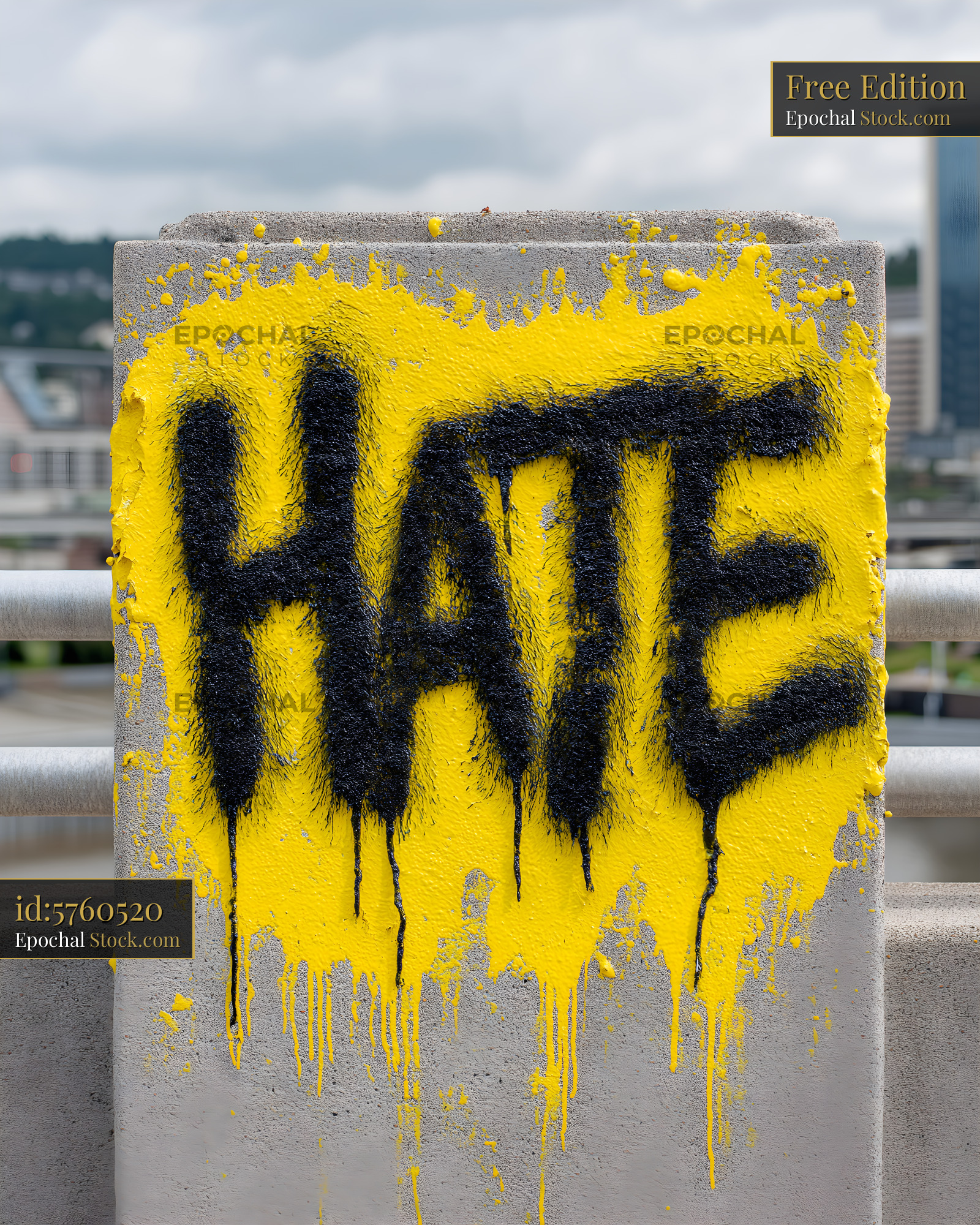 A bold message is painted in black and yellow on a concrete wall. The word is dripping and stands out in the city environment during the day. Nearby buildings are visible in the background.