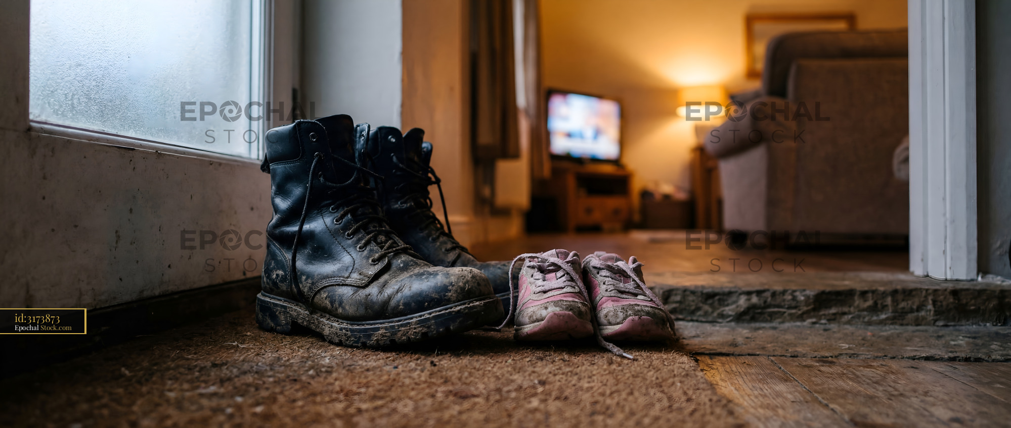 Two pairs of shoes are left by the door inside a house. One pair is large and black, while the other is small and pink. A living room is seen in the background with a TV on.