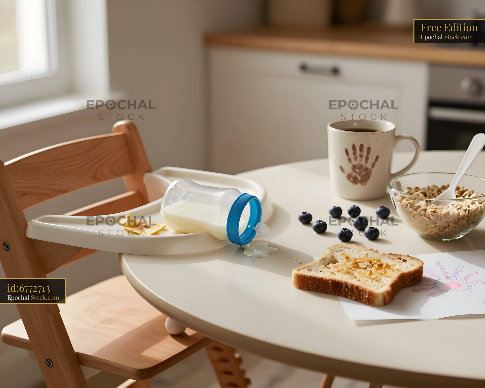 Breakfast time at home with baby chair and food scattered Free Premium Stock Photo