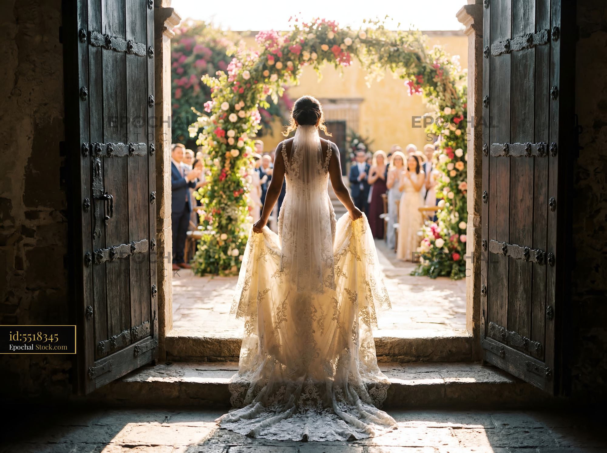 A bride stands at a large wooden doorway looking out at her wedding ceremony. Guests gather under an arch with flowers. The scene is set in a courtyard on a sunny day.