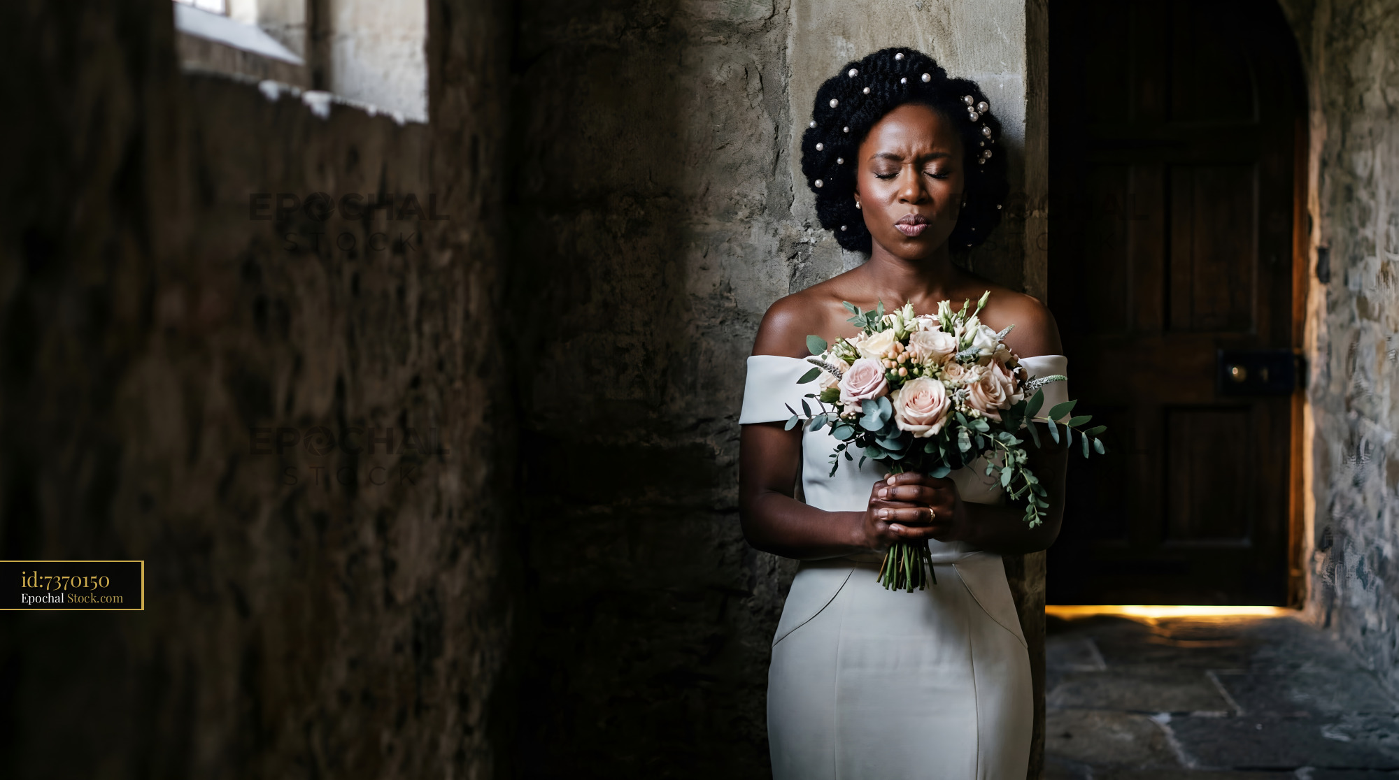 A bride holds a bouquet while standing in a stone hallway. She wears a simple dress and has her eyes closed. The lighting is soft and the walls are textured.