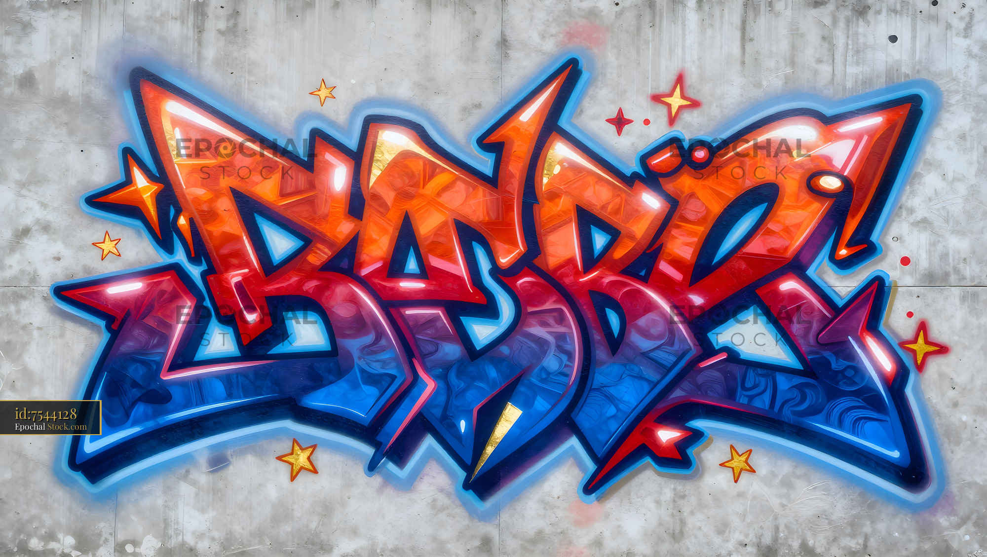 Colorful graffiti covers a concrete wall. The artwork features bold letters with a mix of orange and blue shades. Red stars add a touch of detail to the design.
