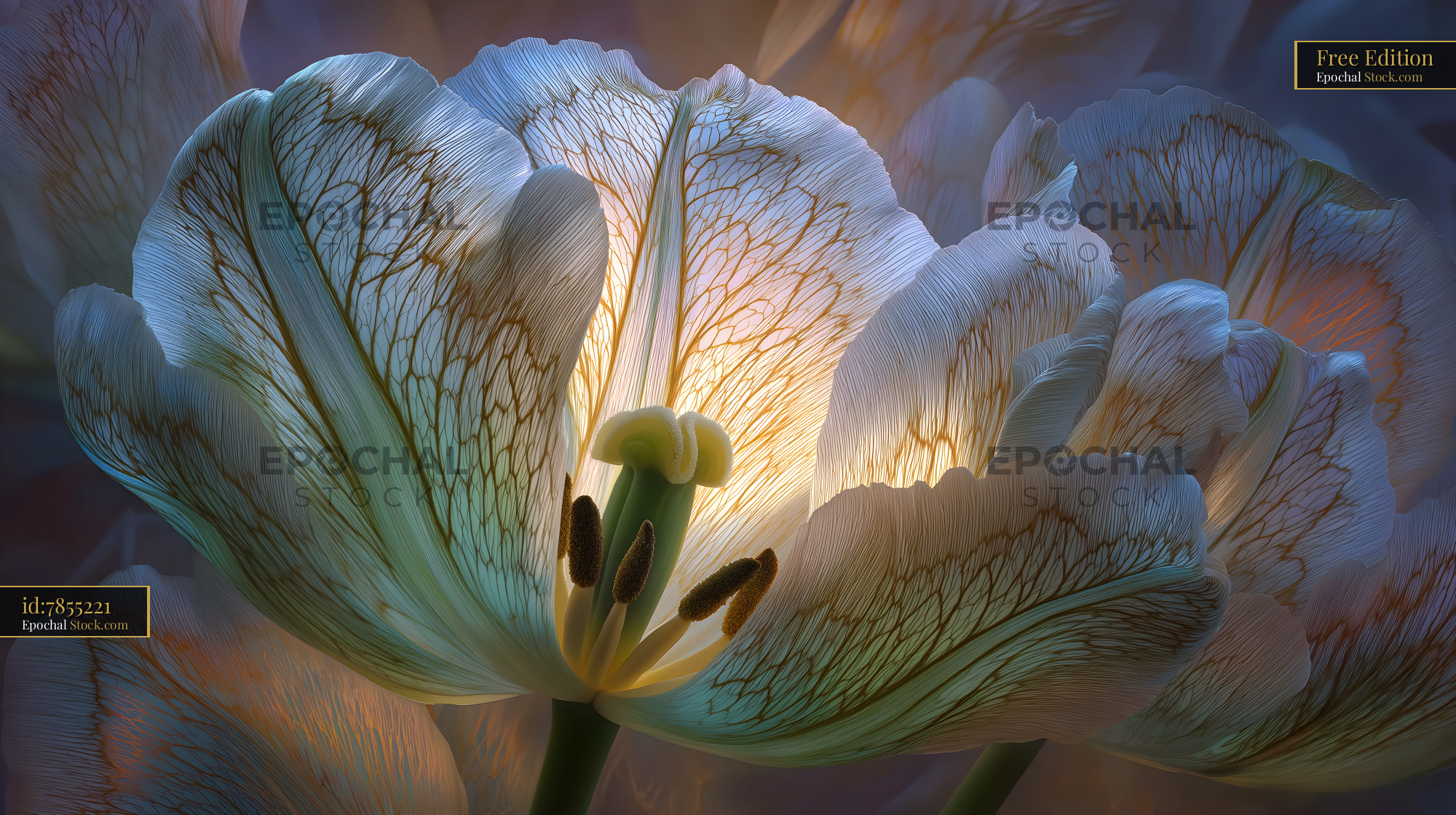 Fresh tulips stand tall, illuminated by soft light in the dark. Their petals glow and reveal intricate details, creating a warm, inviting scene in a garden setting.