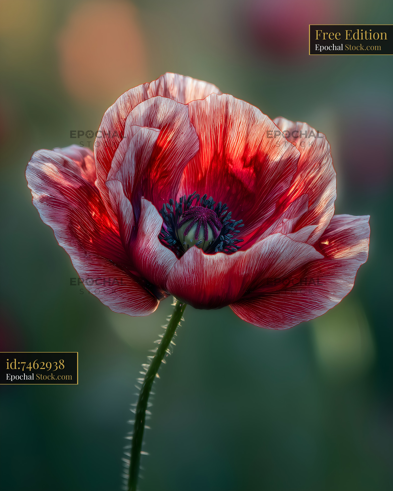 A bright red poppy flower grows on a long stem in a green field. The sunlight shines on the petals, highlighting their shape and texture. This scene shows nature's simple beauty.
