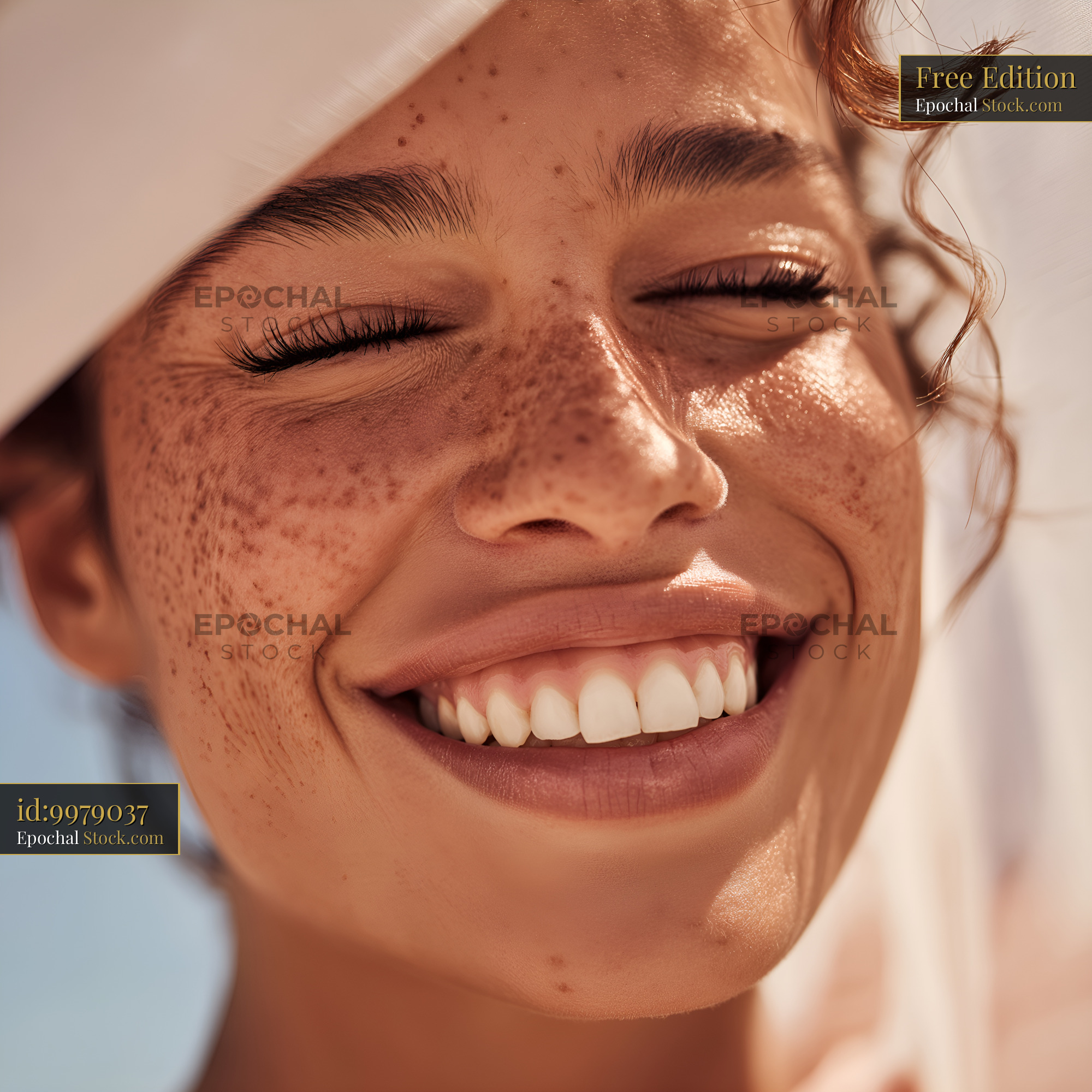 A young woman smiles broadly with visible freckles on her cheeks. She stands against a bright sky and gently holds a white cloth. Sunlight highlights her joyful expression and natural beauty.