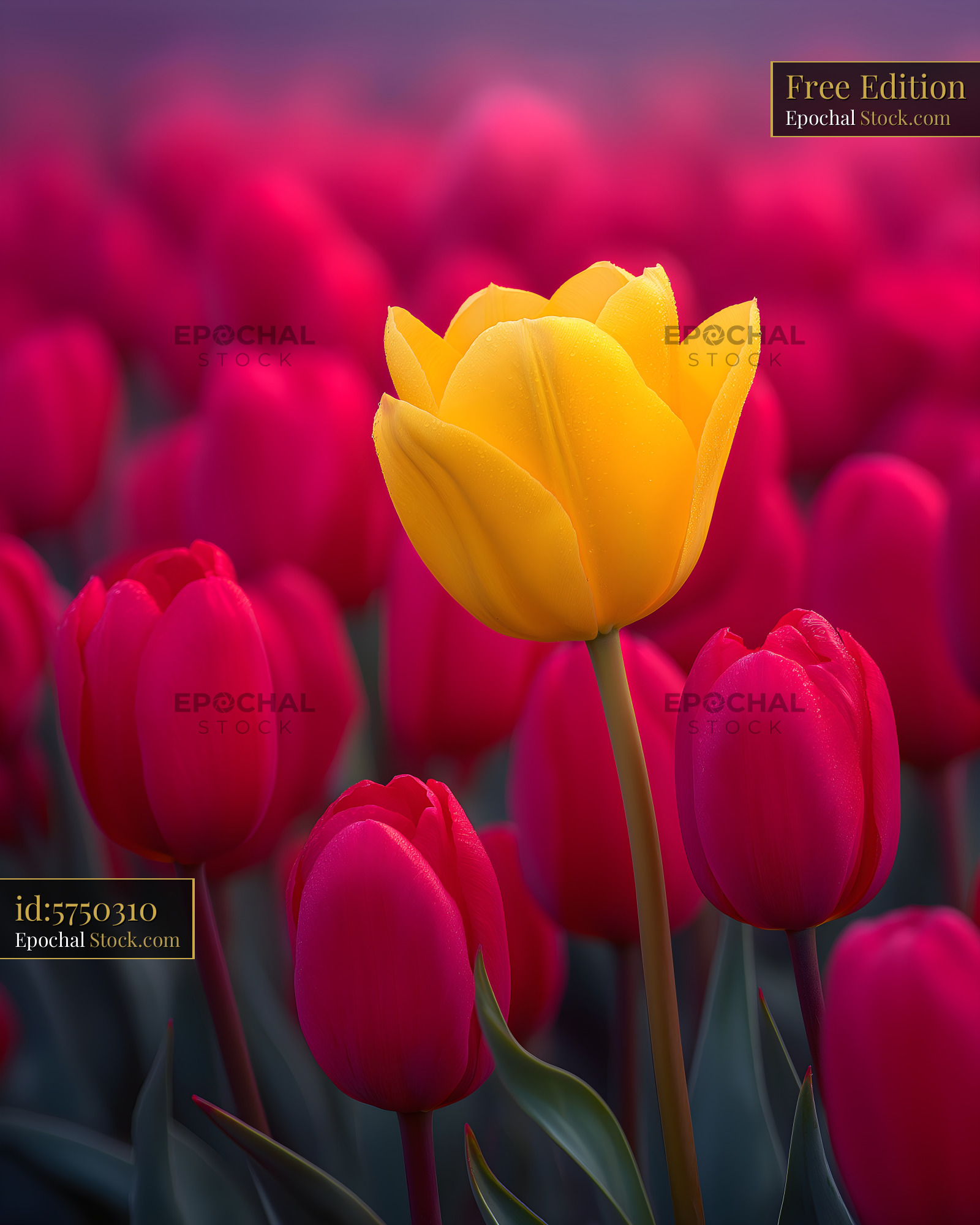 A yellow tulip grows in a field of red tulips. The setting is a garden during springtime. The flowers show their colors under soft light.