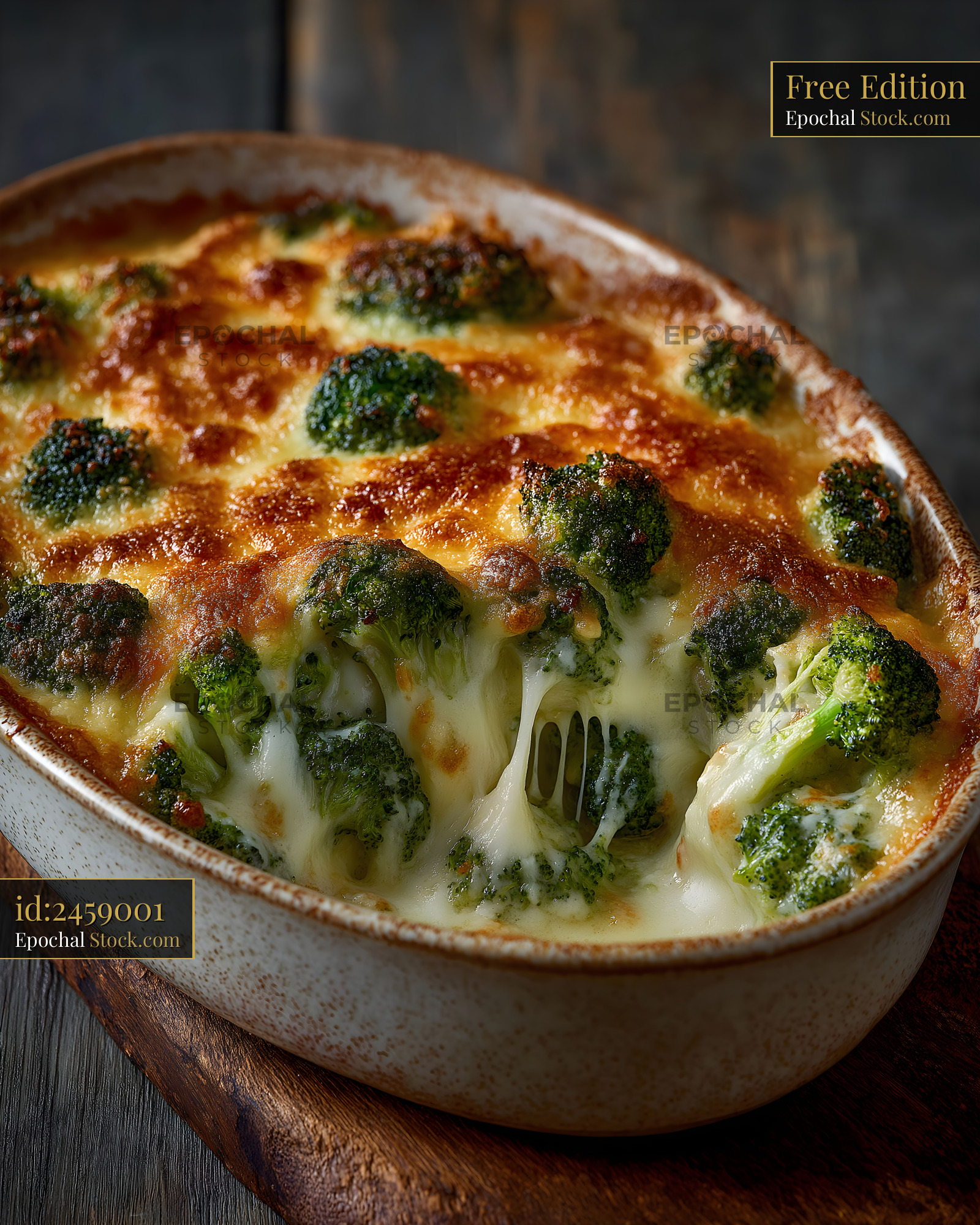 Broccoli is baked with cheese in a round dish. The dish is placed on a wooden table. The food looks hot and ready to be served.