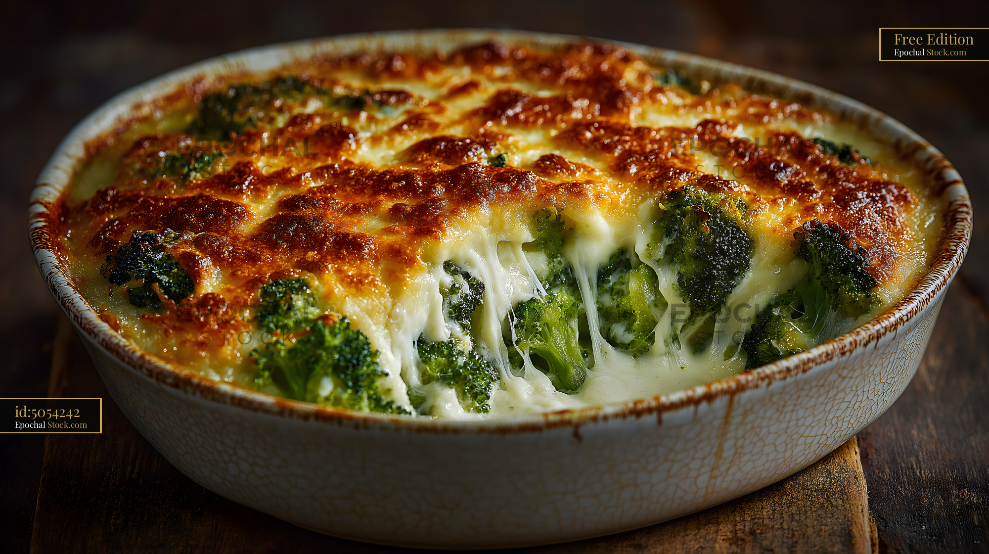A dish of baked broccoli covered in melted cheese sits on a wooden surface. The cheese is golden and bubbling, indicating a hot and fresh preparation.