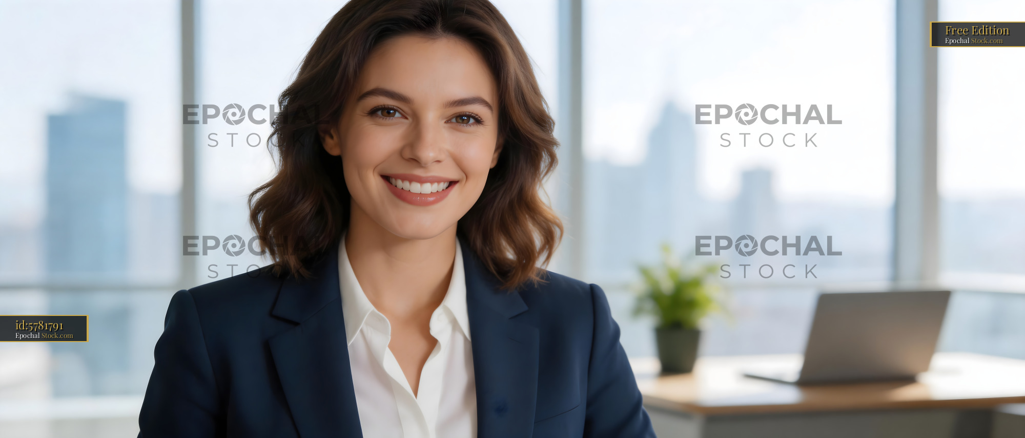 A woman sits at her desk in a modern office with a city skyline outside the window. She smiles confidently while wearing a business suit. Plants and a computer are on her desk.