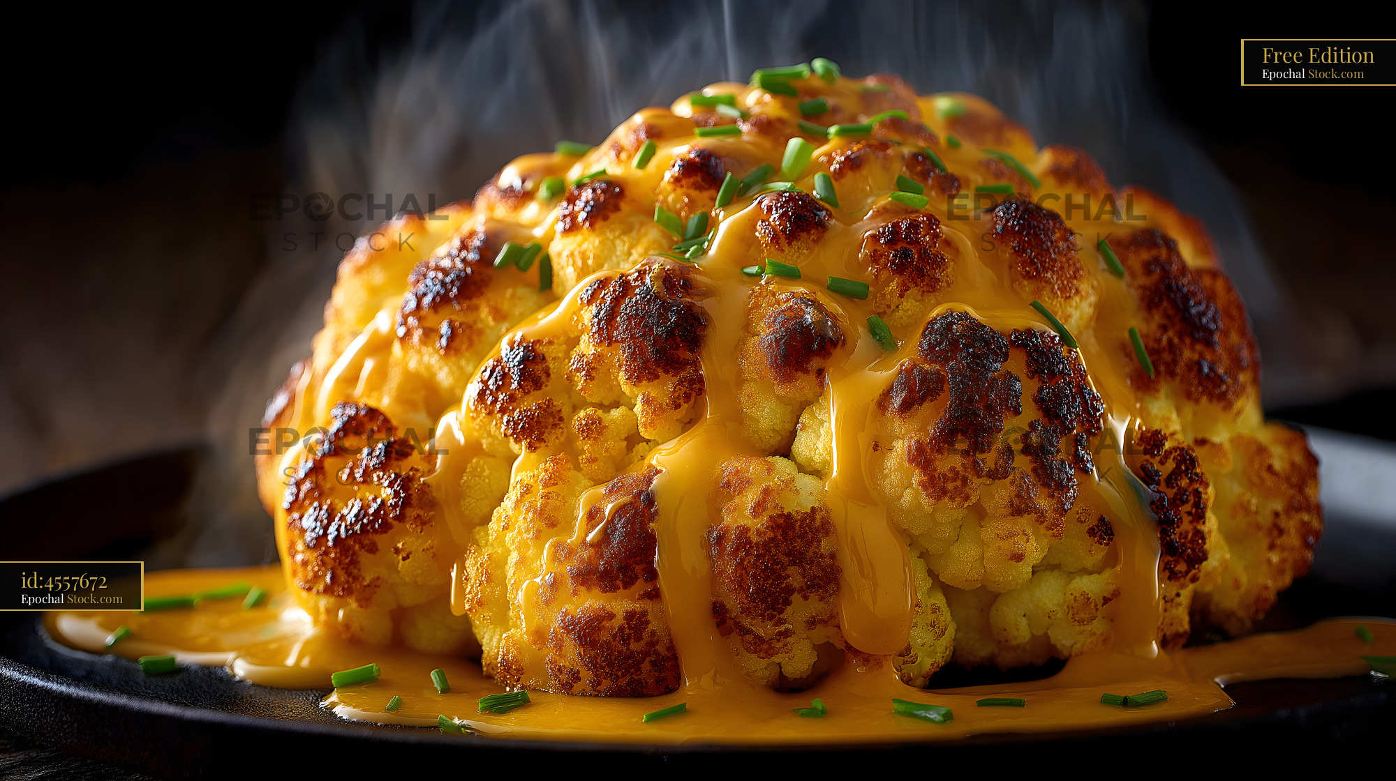 A roasted cauliflower head sits on a black plate. Cheese sauce drips down the sides. Chopped herbs are on top. Steam rises from the dish. It is served warm at a dining table.