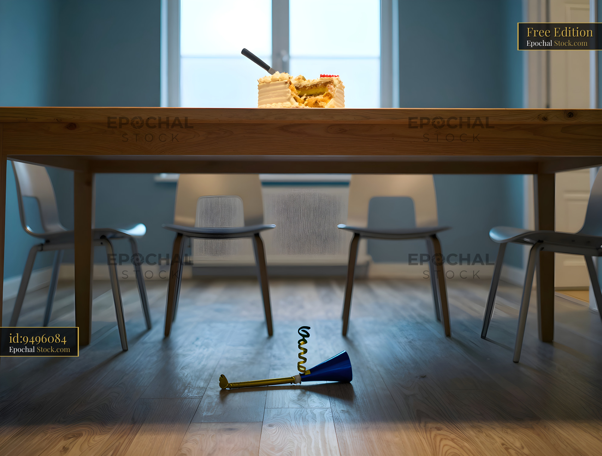 A wooden table sits in a room with blue walls. A cake is placed in the center while a party horn lies on the floor. Four chairs surround the table ready for a gathering.