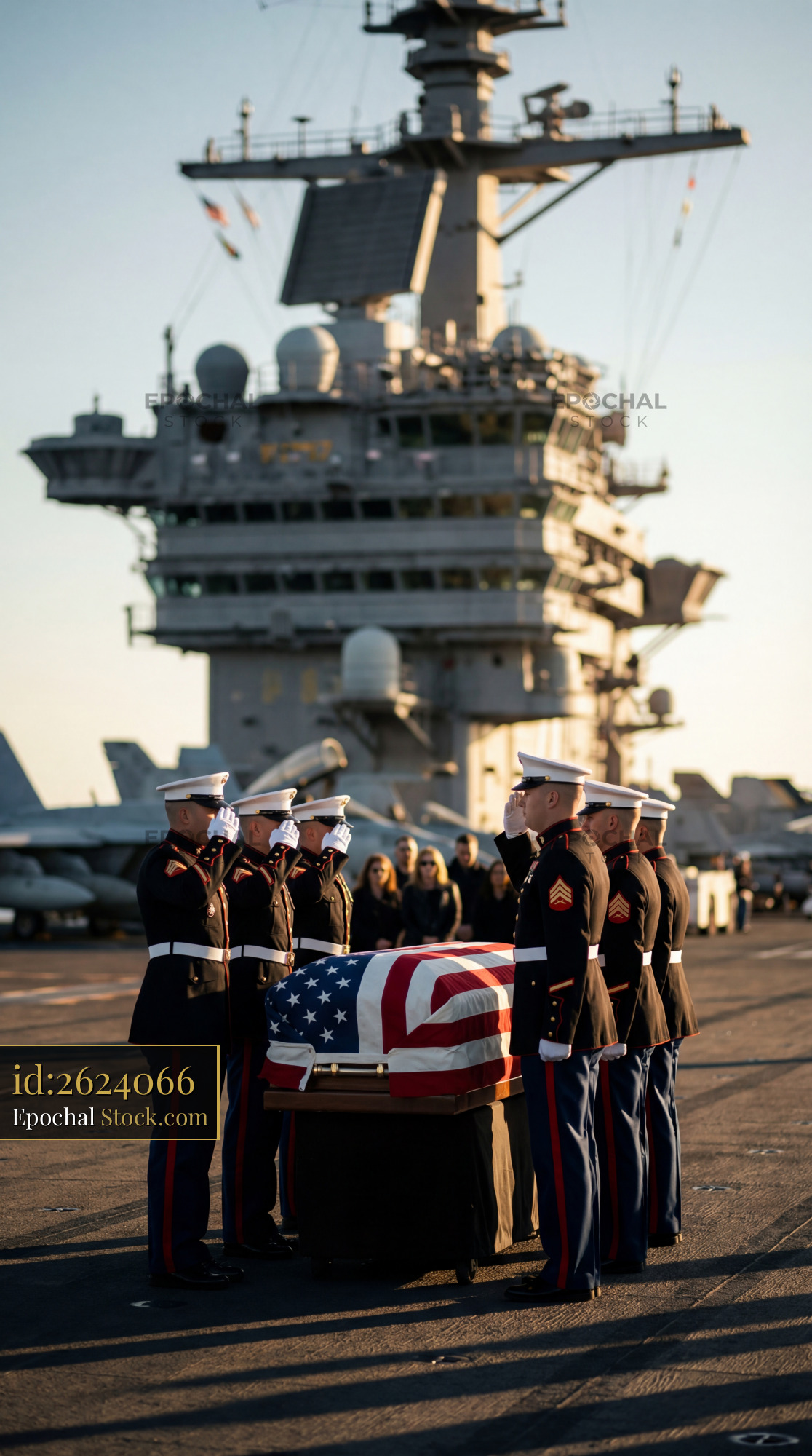 Service members stand in formation around a flag-draped casket on a military ship deck during a ceremony for a fallen soldier at sunset. The scene shows respect and reflection.