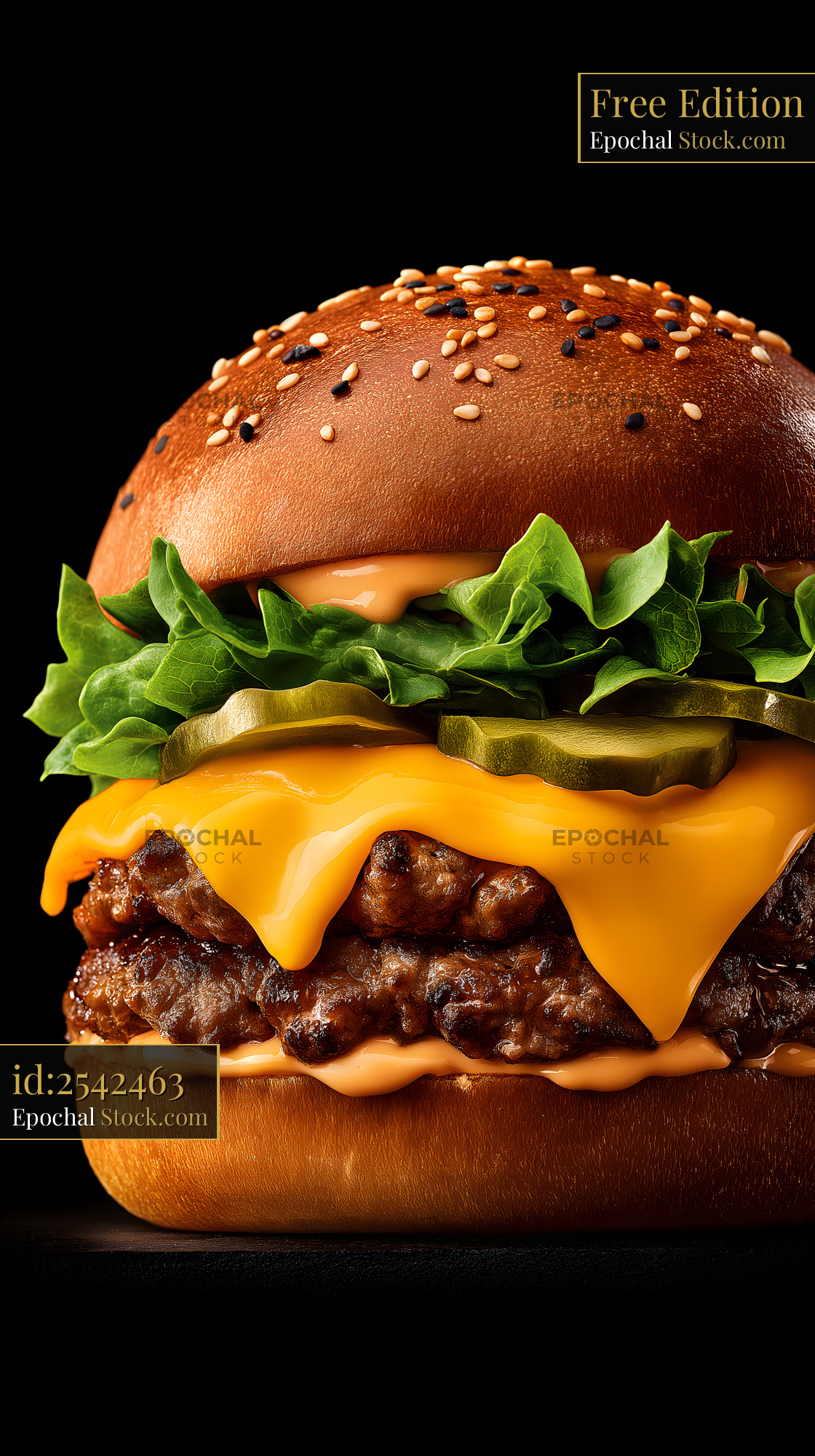 This burger has two beef patties and melted cheddar cheese. It includes lettuce, pickles, and sauce. The bun has sesame seeds and stands out against a dark background.