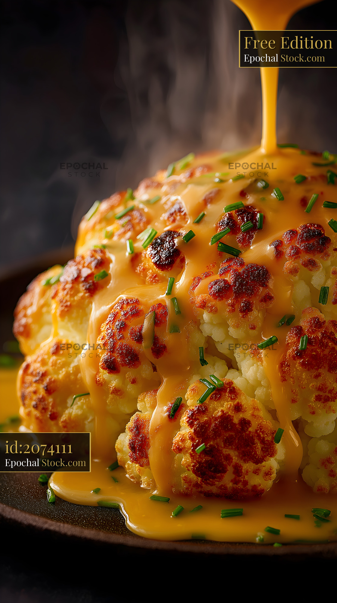 Cheesy sauce dripping over cooked cauliflower on a plate Free Premium Stock Photo