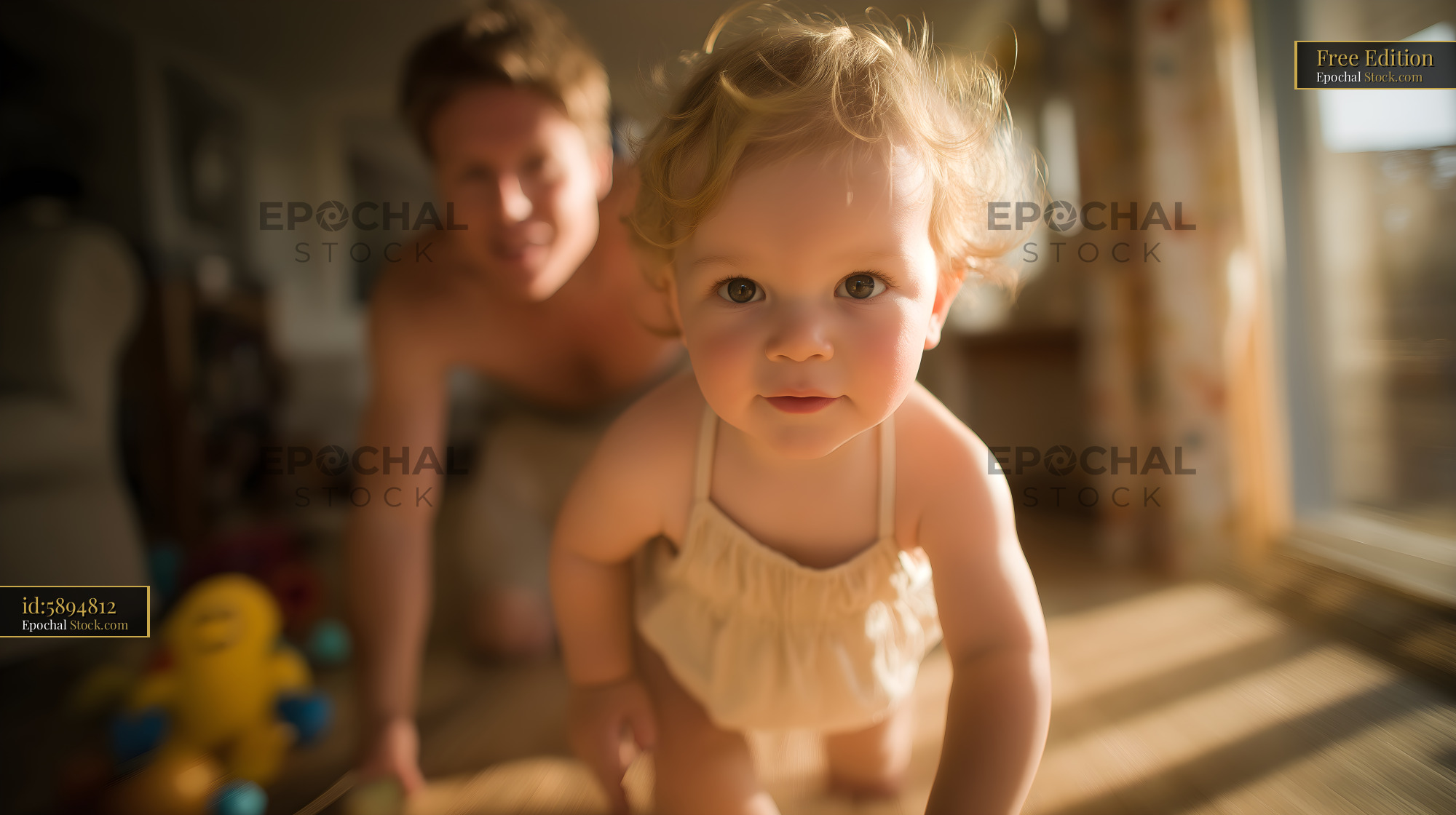 A child is crawling on the floor in a room. An adult is watching with a smile. Sunlight comes through the window and shows toys scattered around the floor.