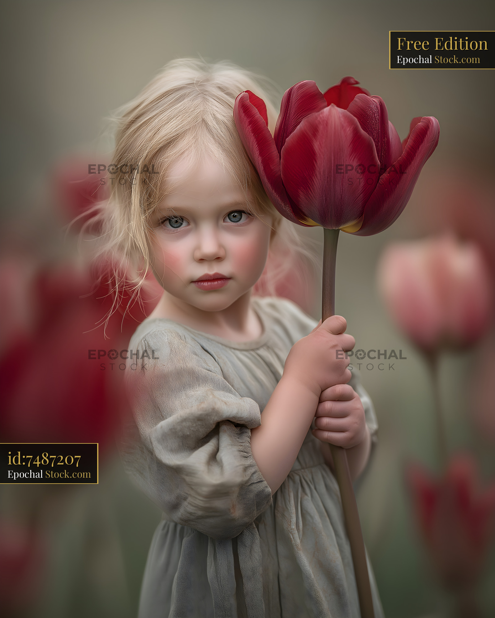 A child stands in a garden filled with red flowers. She holds a large red flower close to her face. The scene shows the beauty of nature in spring.
