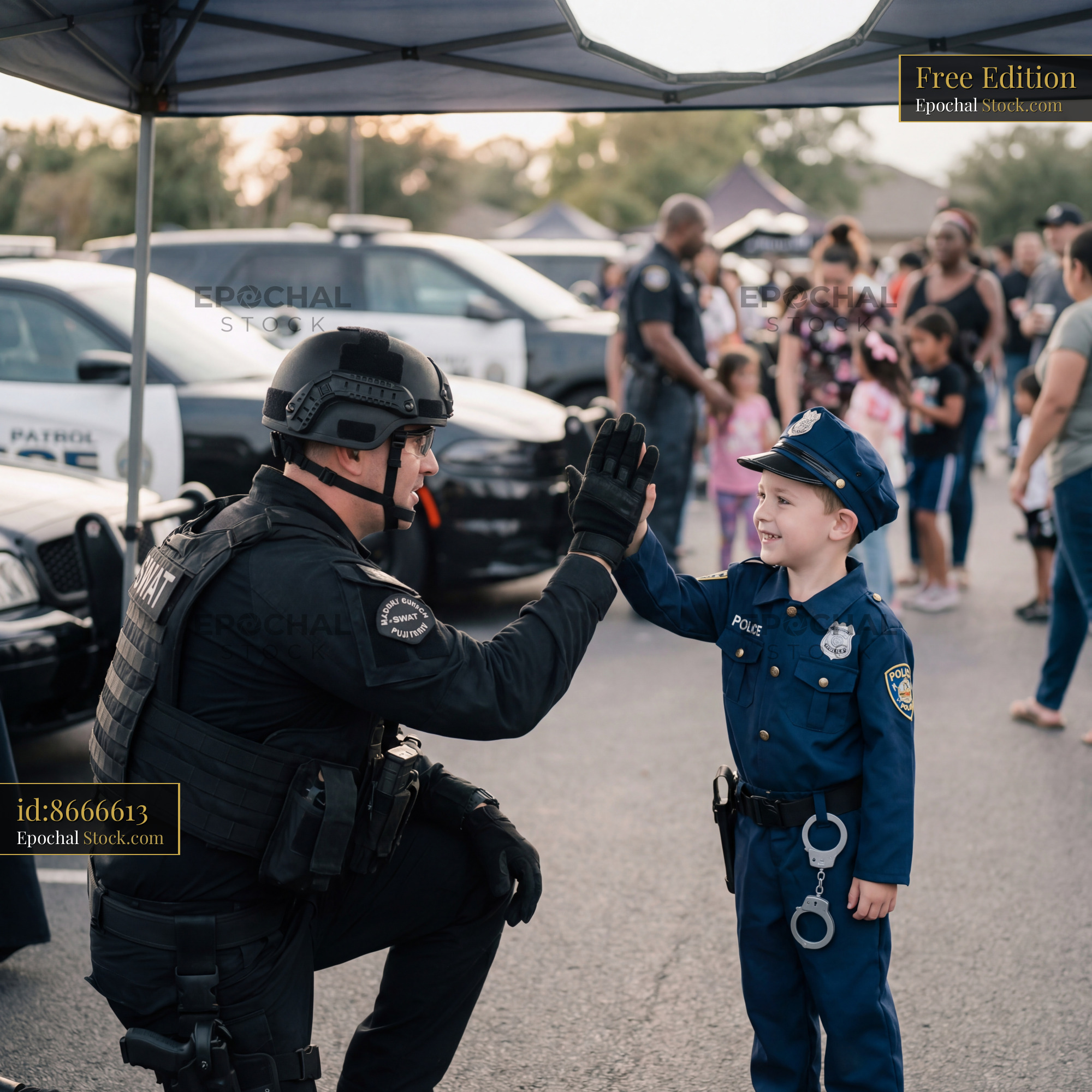 A young child dressed as a police officer shares a high five with a police officer. People gather around at a community event in a parking area during the evening.