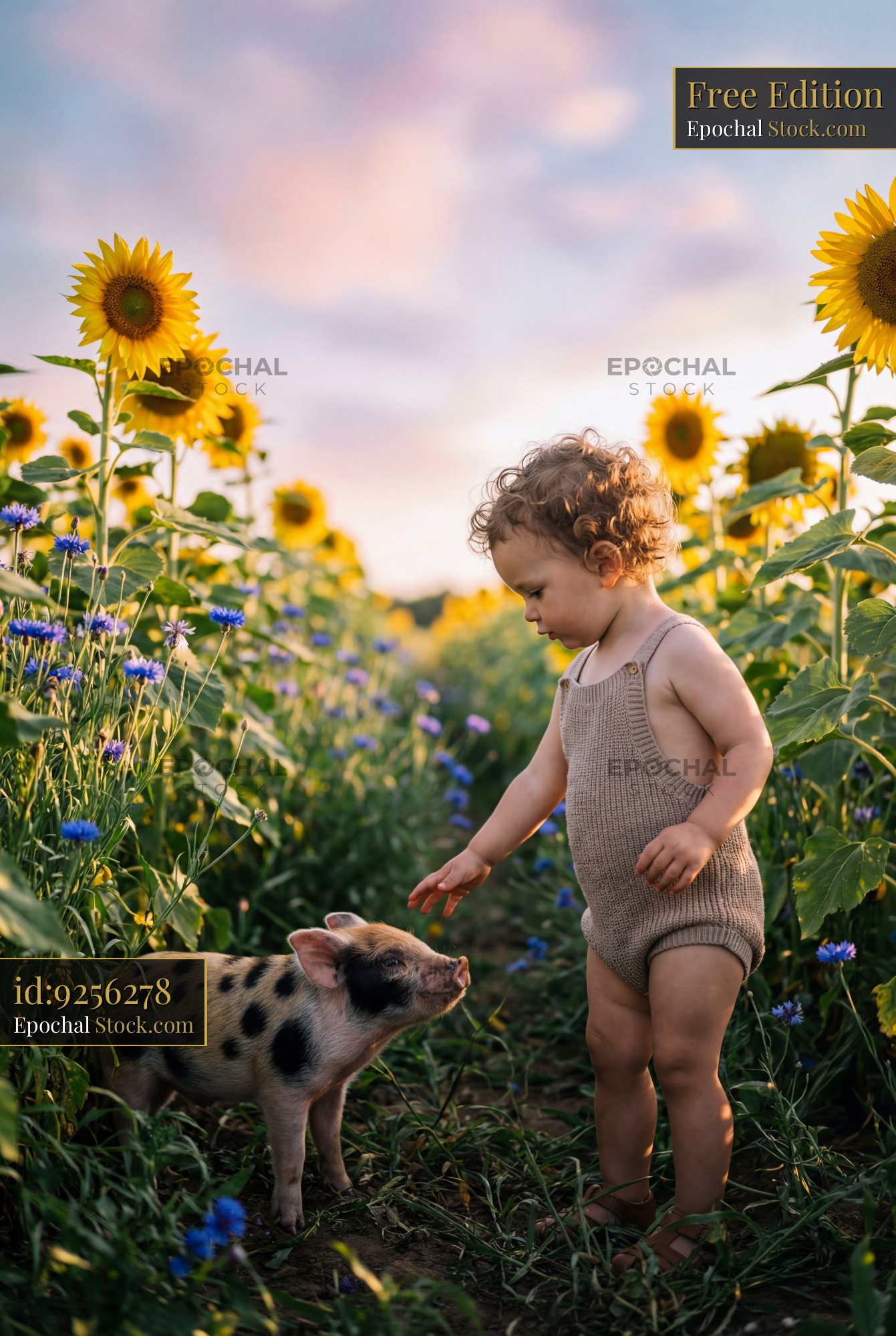 A child stands in a field of sunflowers, reaching out to a small pig. The sun sets in the background, creating a warm glow. The scene shows nature and a child's curiosity about animals.
