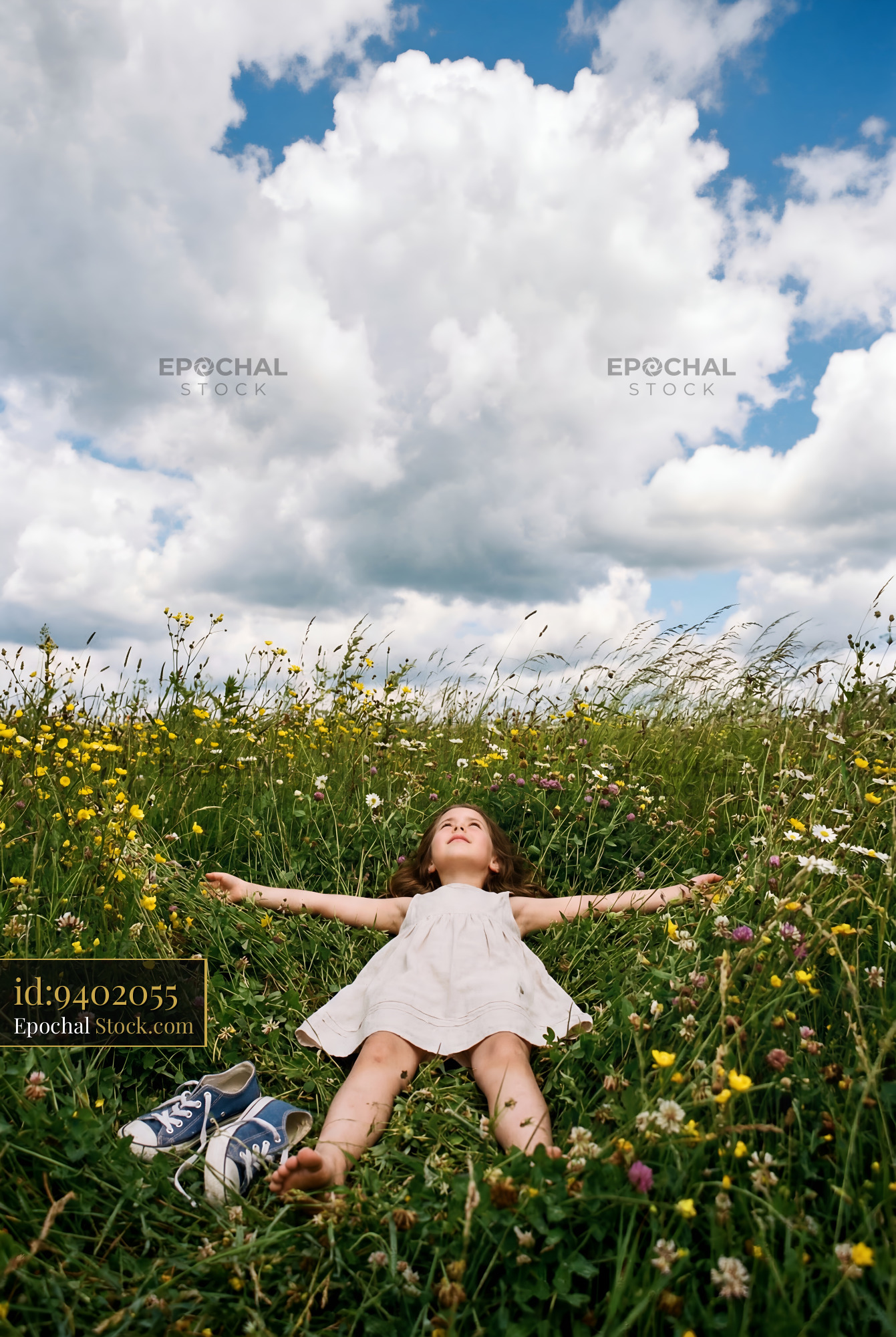 A girl lays in a field of flowers with arms outstretched. Clouds cover the sky, and her shoes are nearby. She enjoys the warm afternoon in nature.