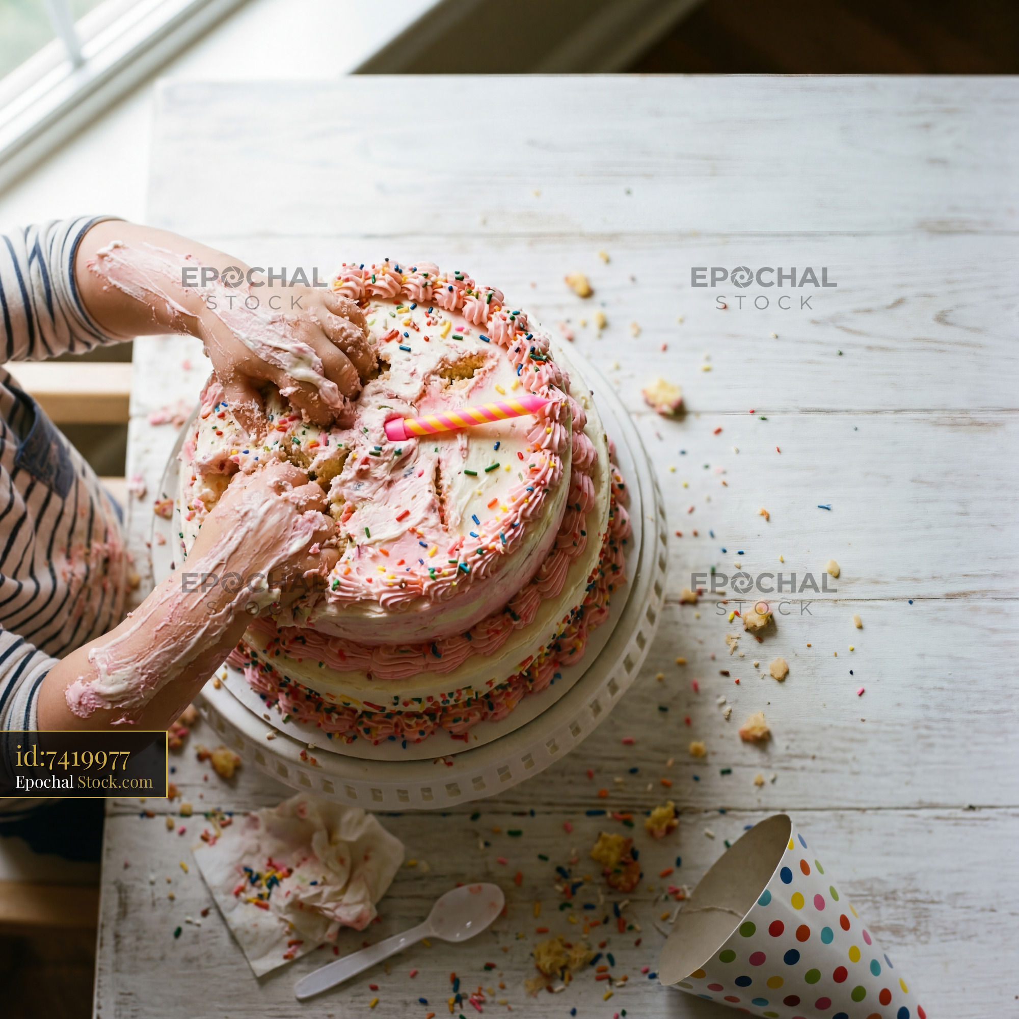 Child plays with cake during birthday celebration at home Premium Stock Image