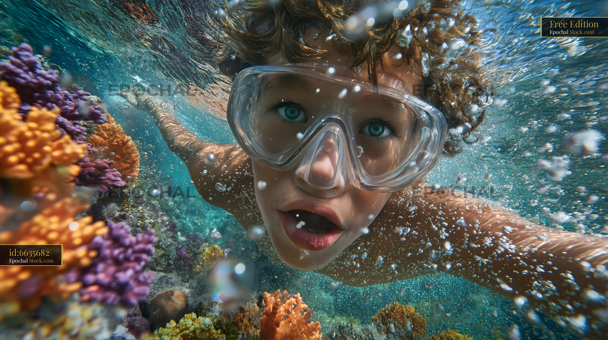 A child with a snorkel mask is swimming in clear water. The child is enjoying the underwater scene with bright coral and various fish nearby. Sunlight shines through the water.