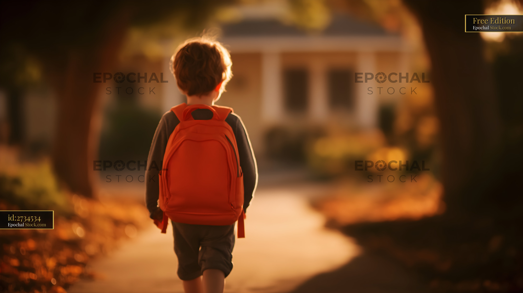 Child walks down path with orange backpack in afternoon light Free Premium Stock Photo
