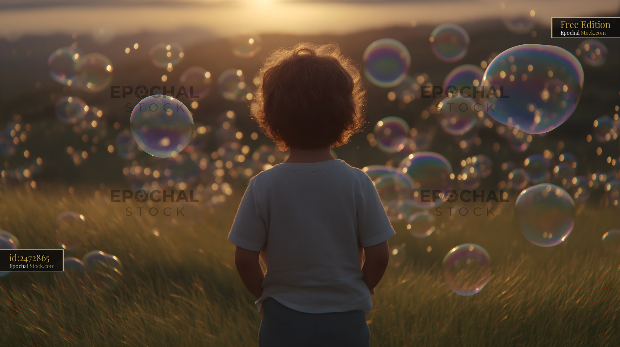 A child stands in a field and looks at bubbles rising in the air as the sun sets in the background. The scene captures the child's curiosity and the beauty of the moment.