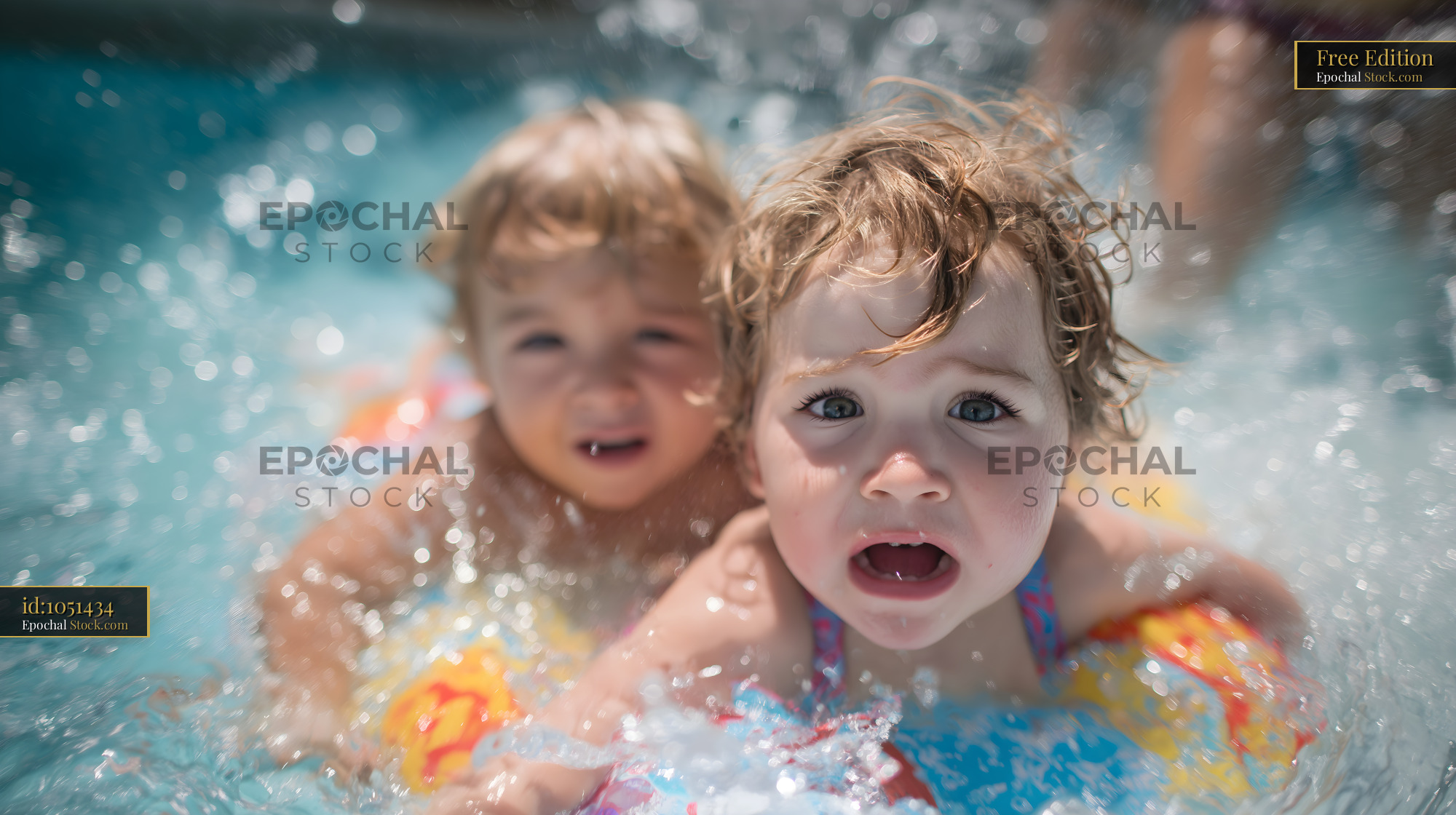Two children swim in a pool, surrounded by splashes of water. They wear inflatable floaties and appear to be enjoying their time while playing together in the water.