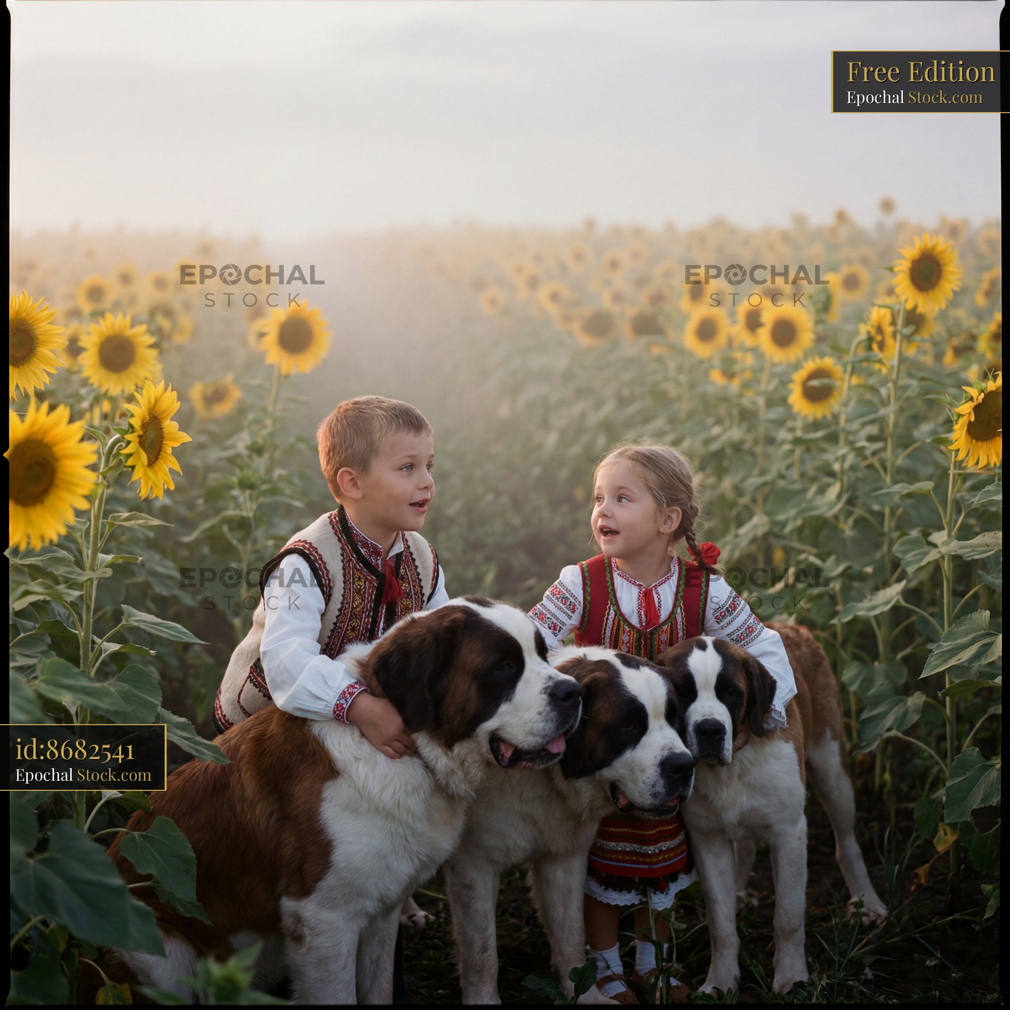 Two children stand in a field of sunflowers. They are dressed in traditional outfits and play with three dogs. The sun is setting, creating a soft light around them.