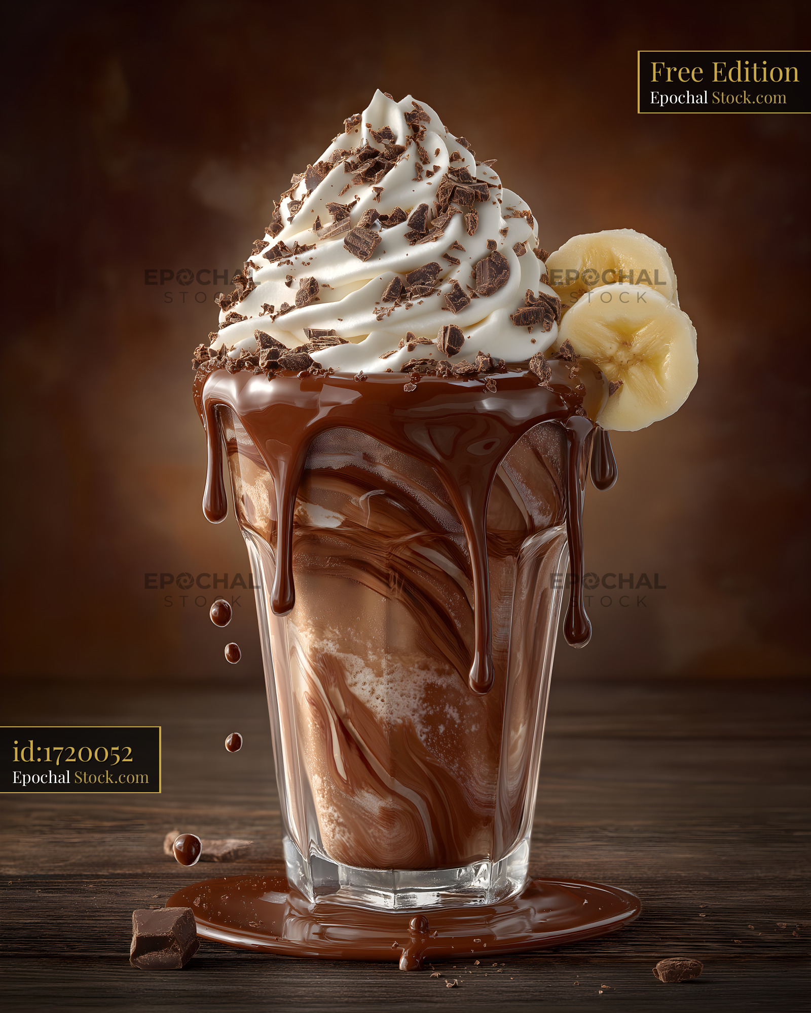 A tall glass filled with chocolate ice cream topped with whipped cream. Chocolate drizzle and banana slices add to the look. It is placed on a wooden table.