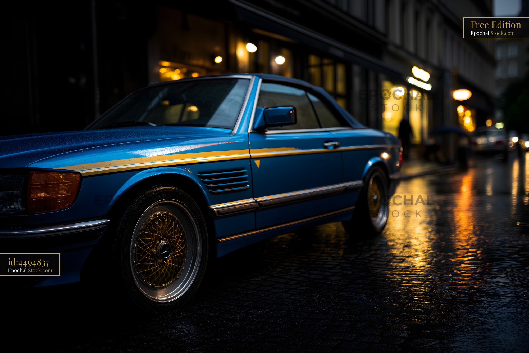 Classic blue car parked on a wet street at night Free Premium Stock Photo