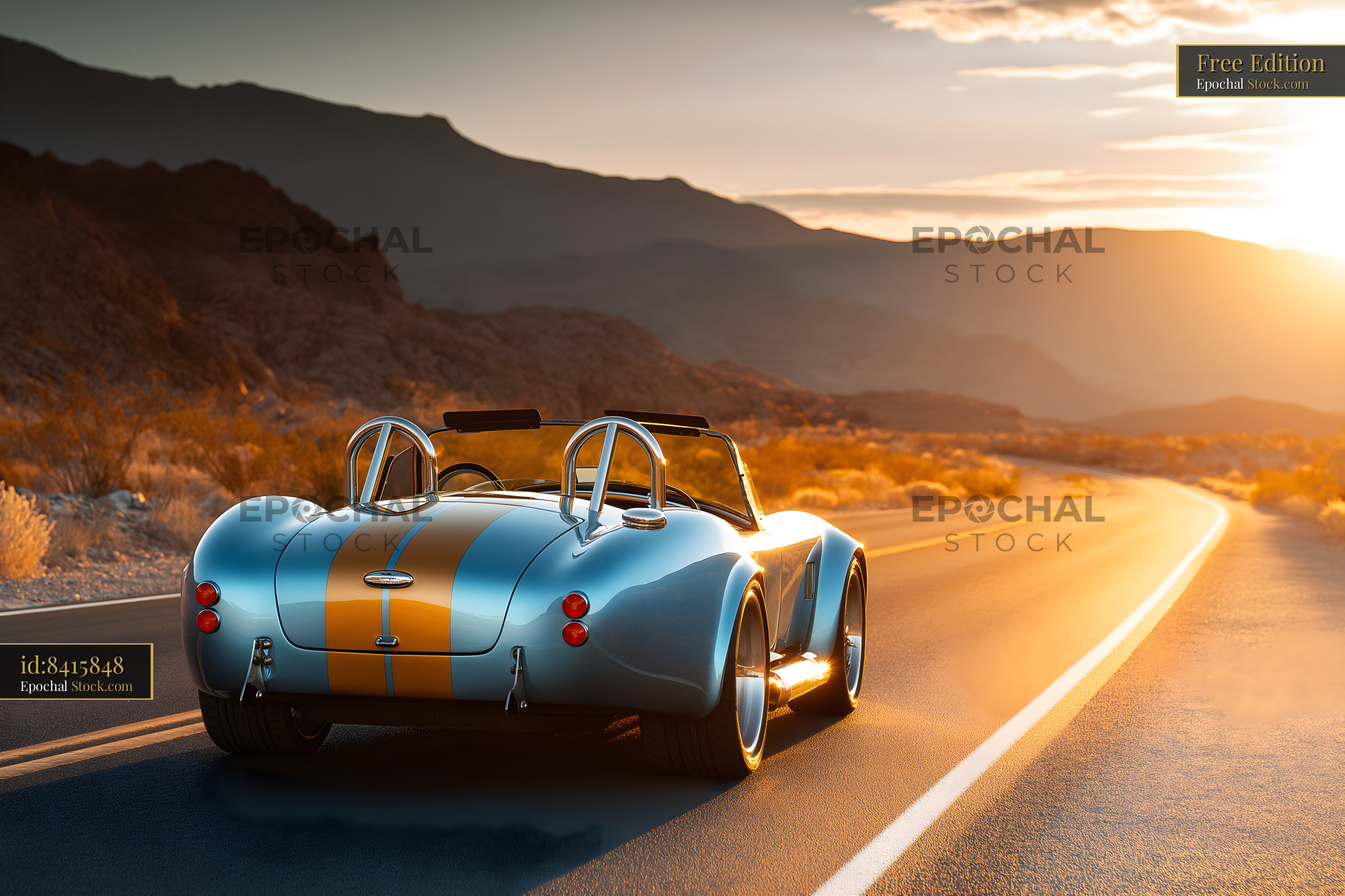 A classic car with blue paint and orange stripes drives along a straight road surrounded by mountains. The sun sets in the background, creating a warm light on the scene.