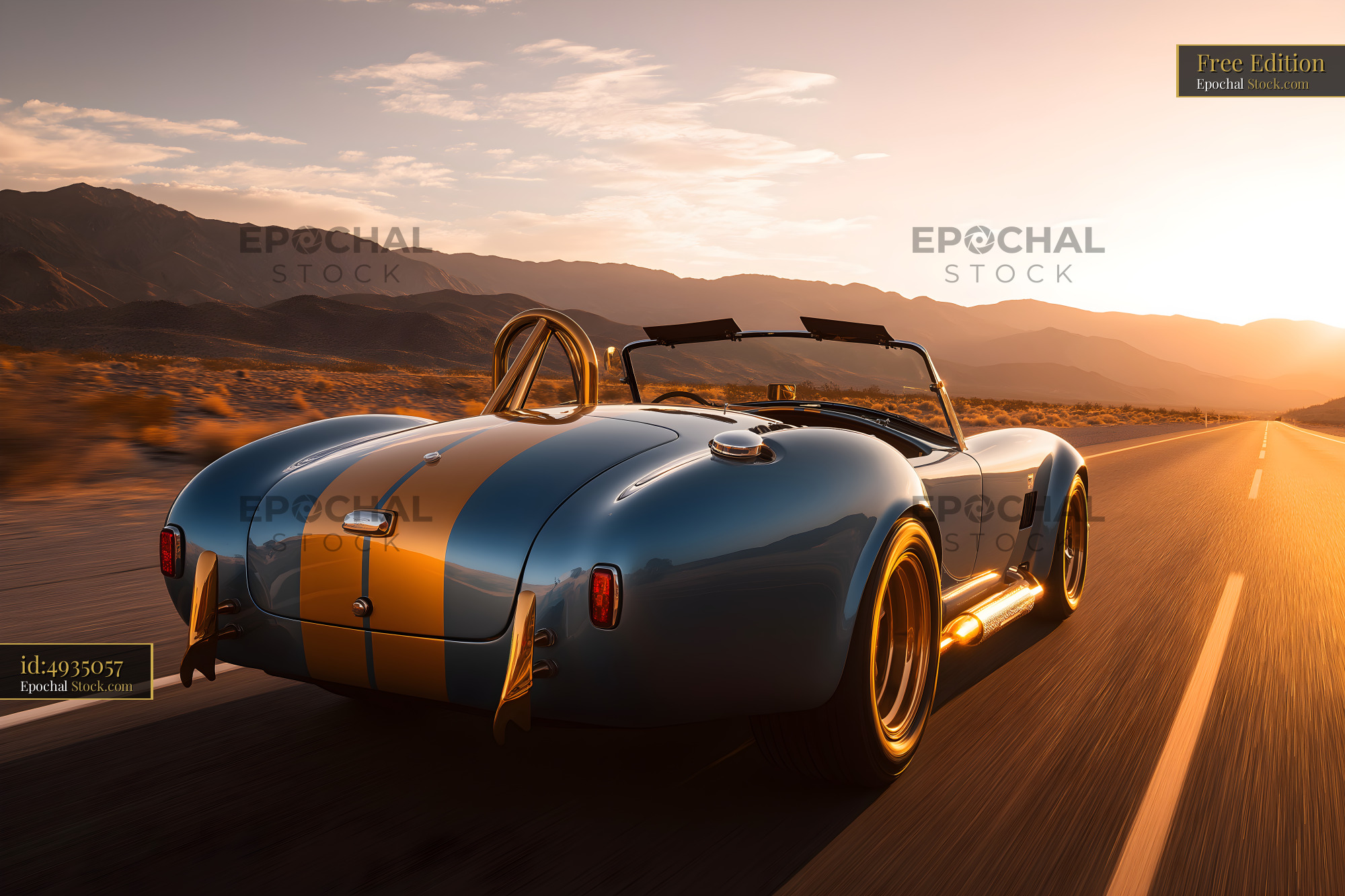 A classic sports car drives along a highway at sunset. The sun sets behind mountains, casting a warm glow on the road. The car has a blue body and gold stripes.