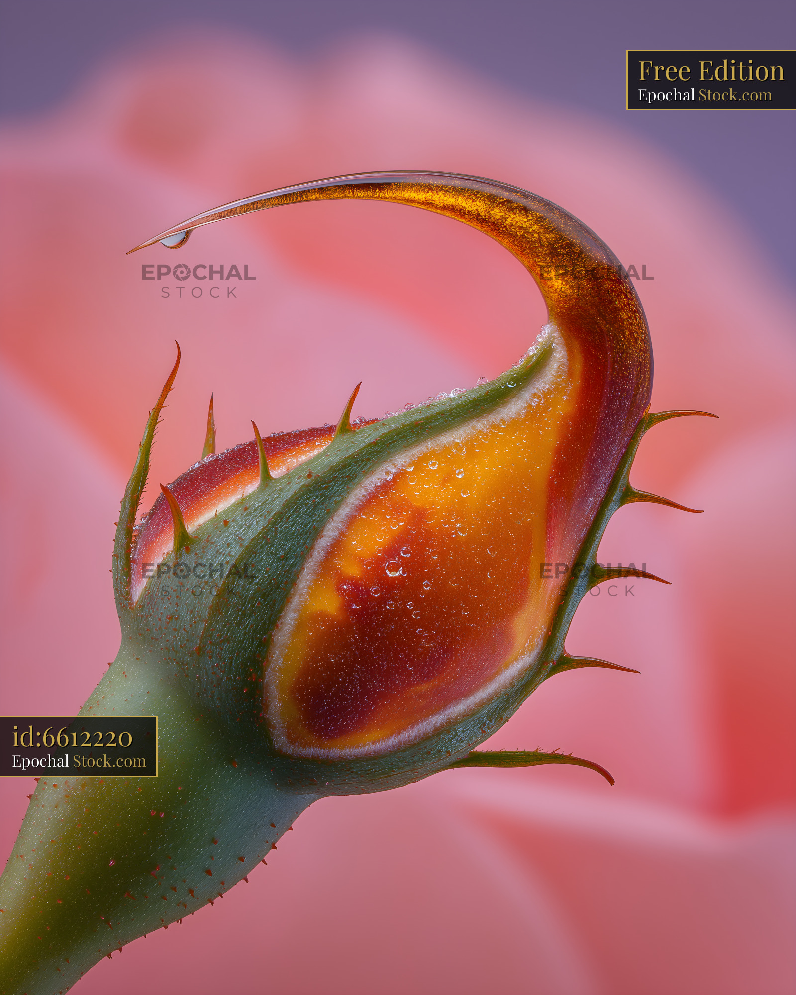 A rosebud shows vivid colors and a water droplet on its surface. The background is soft pink, creating a natural scene. The lighting highlights the details of the flower.