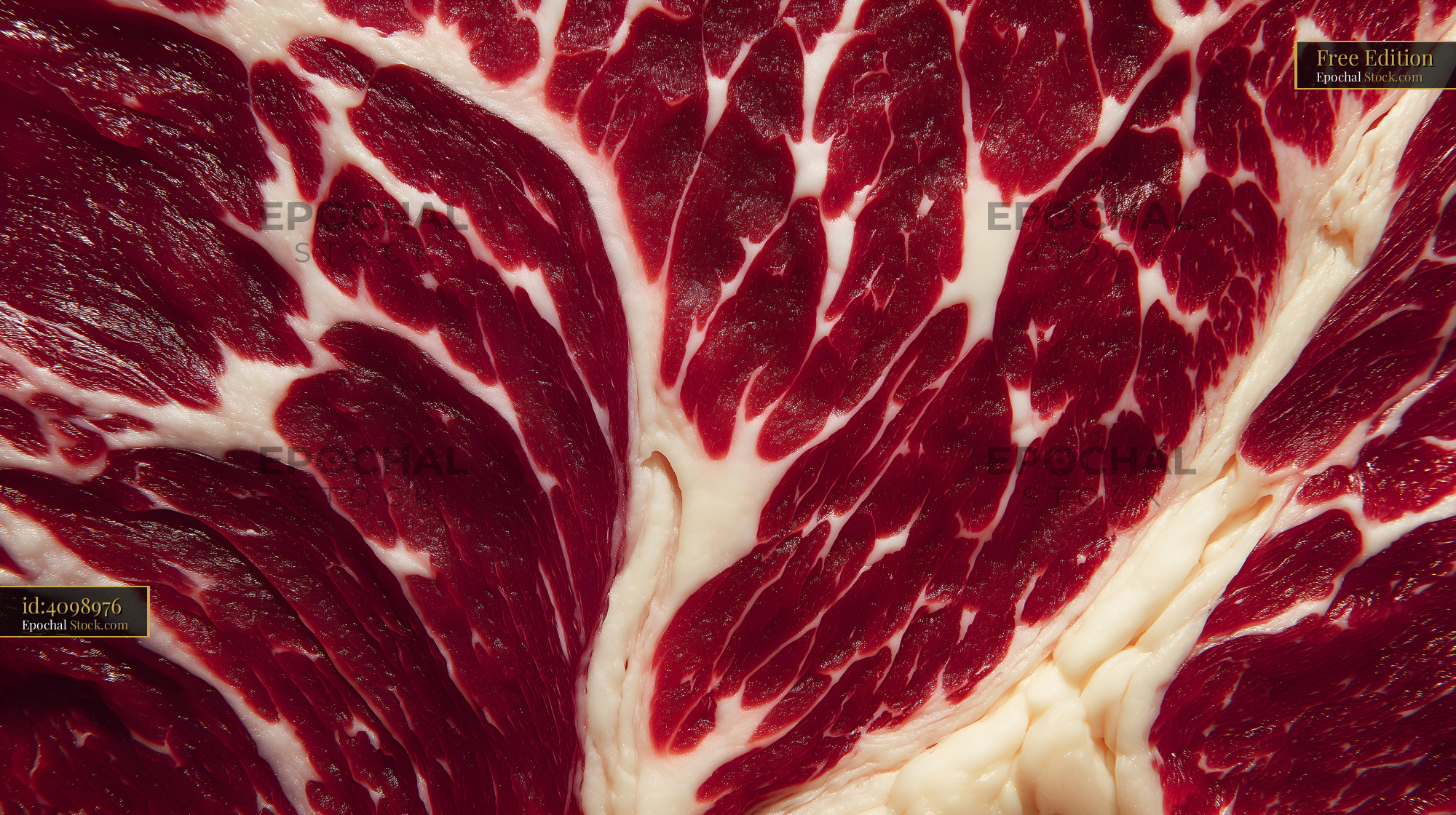 The picture shows marbled beef cuts laid out in a market. The red meat shows intricate patterns of fat, which highlight the quality of the cuts. This scene captures the details of fresh meat.