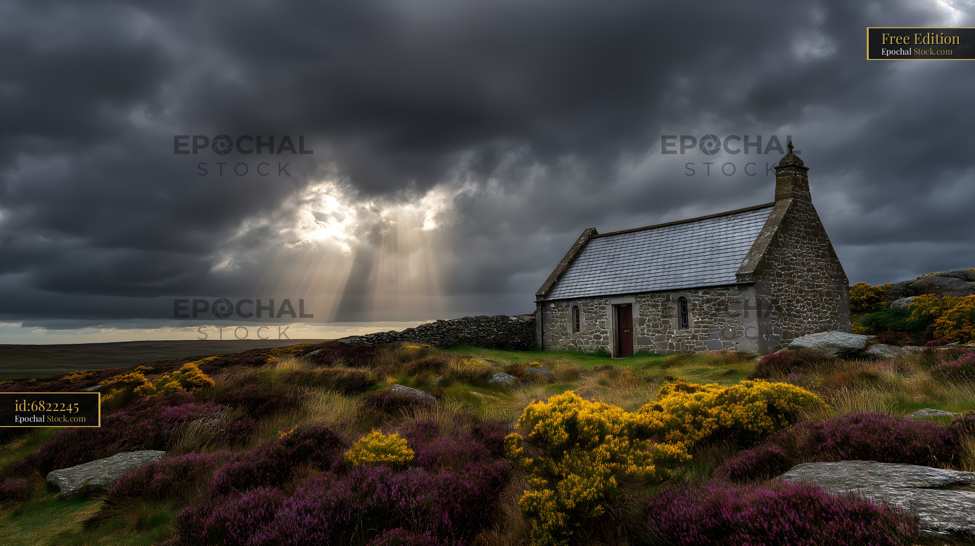 A stone building stands in a field with purple flowers. Dark clouds cover the sky, and light beams shine through. This scene shows a rural area with natural beauty and solitude.