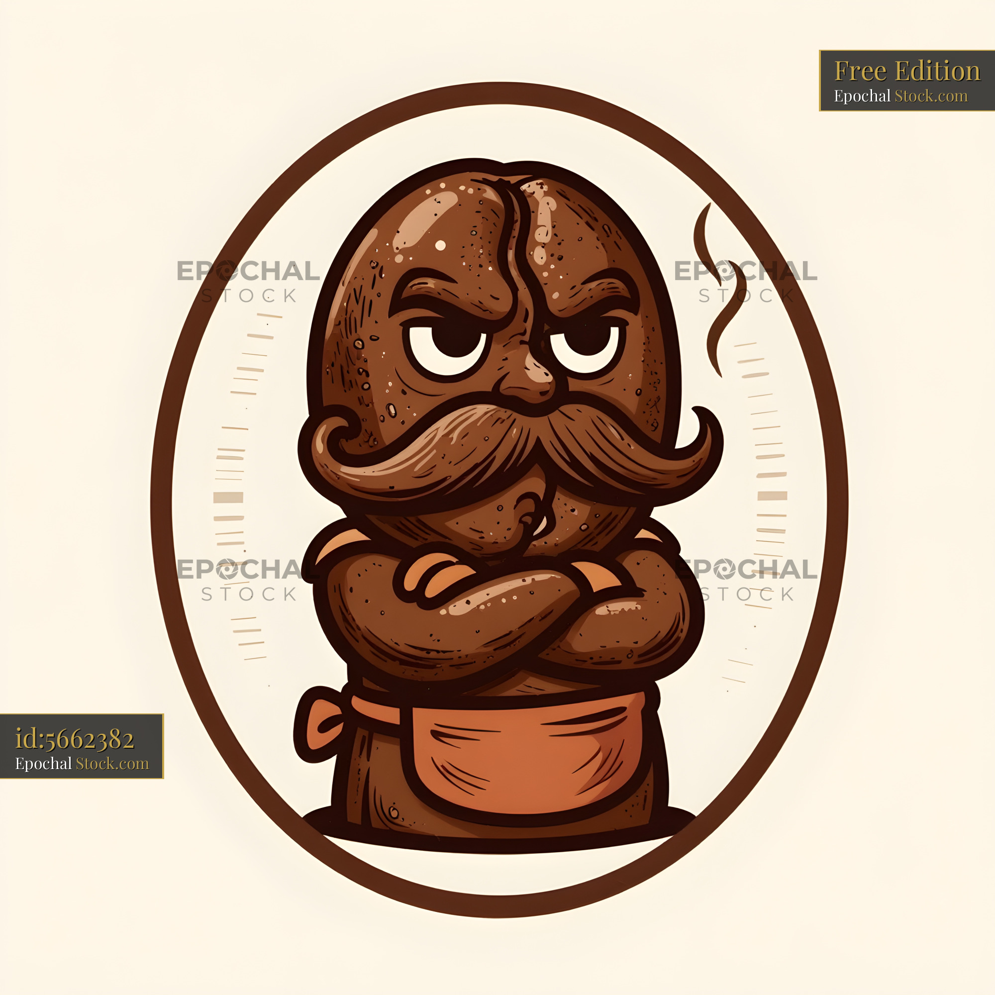 A cartoon coffee bean stands with arms crossed. It has a mustache and wears an apron. The background is simple and cream colored. The character looks serious, showing its strong personality.